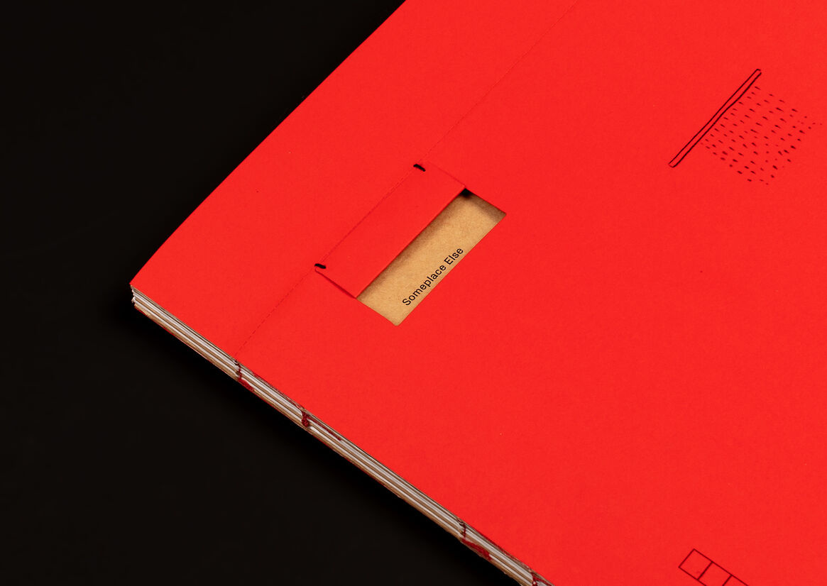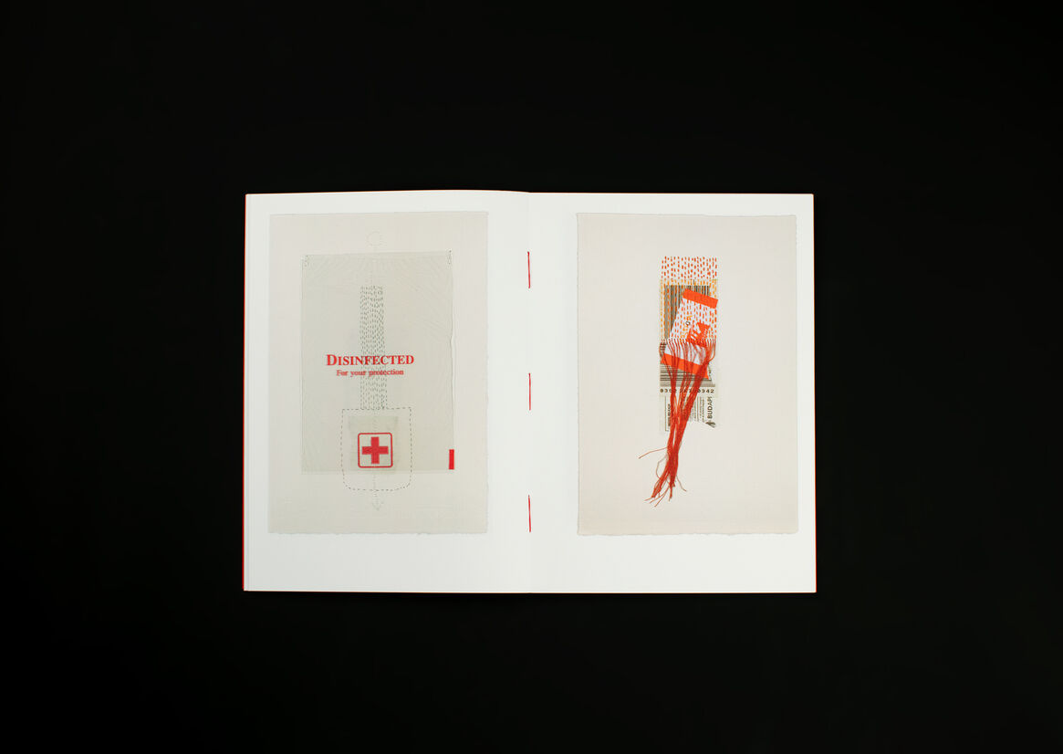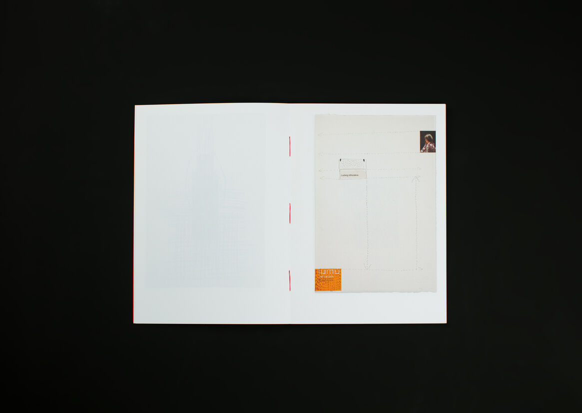 Kerr drew directly from the drawings to inform the design of the publication. On the vibrant cover (printed on Curious Matter Désirée Red), she selected elements from the collection to create a new collage which envelopes the content and responds directly to the work. The perforated line, suggesting the tearing of a boarding pass or ticket, and the red thread of the binding echo Stevenson’s stitching methods found throughout the collection. On the front cover, Stevenson hand-stitched a folded paper flap to reveal the title, repeating an action from one of her early artworks. This action was then repeated for all seventy-five copies of the publication, the artist’s hand present in each book.