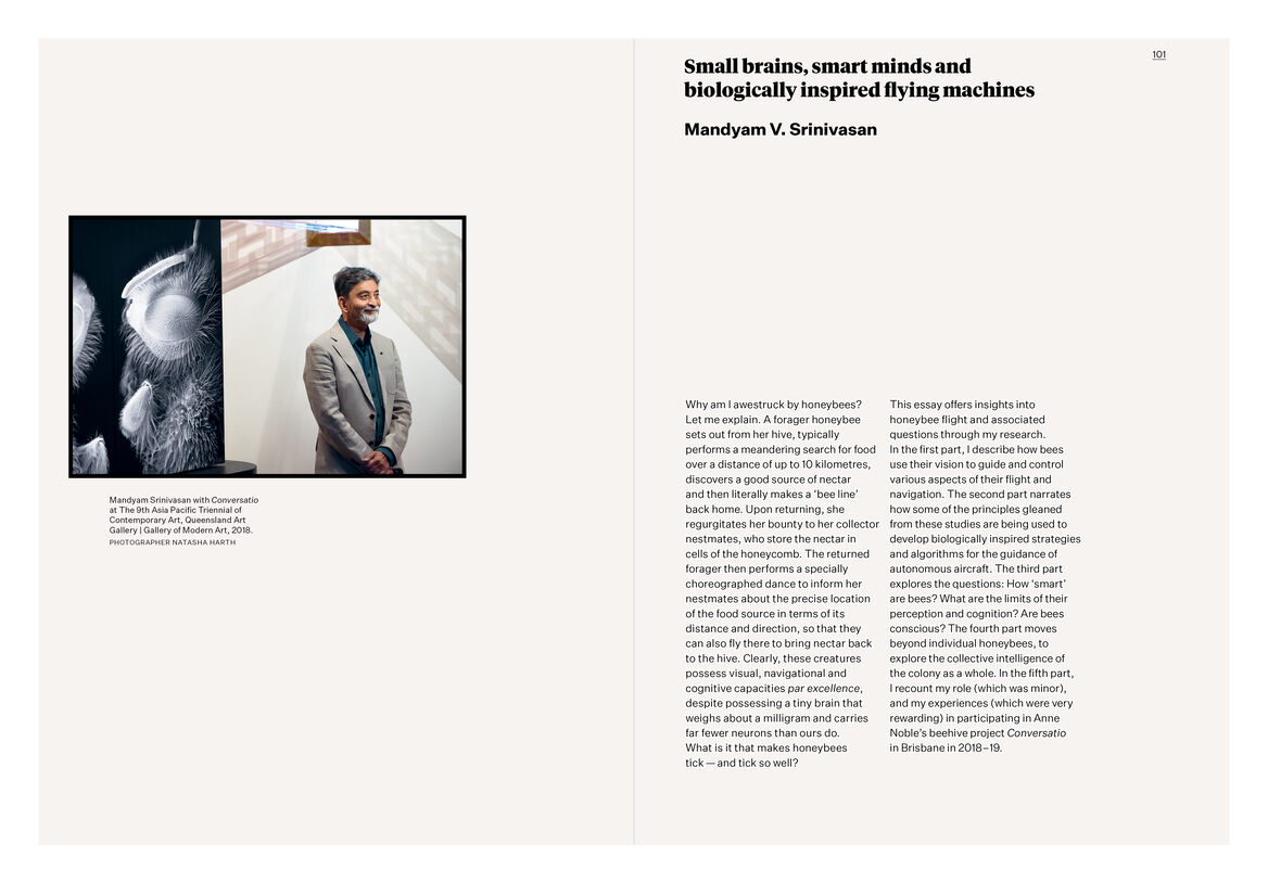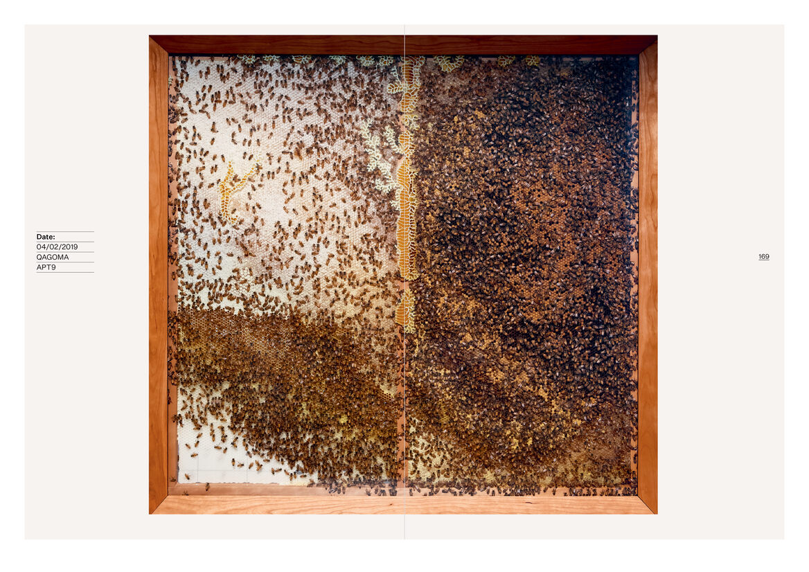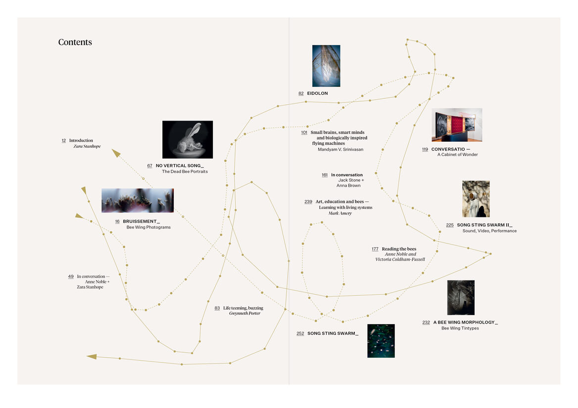 The contents page presents the photography and text in parallel structure. Both are linked by a zig-zagging bee flight path, as opposed to a traditional linear layout. As the reader-explorer moves inwards, they find in the midpoint of the book the exhibition which represents the culmination of Noble’s bee journey at the Asia Pacific Triennial in Brisbane. This echoes the visitor experience of opening up the doors of the Cabinet of Wonder to reveal the observation hive within.