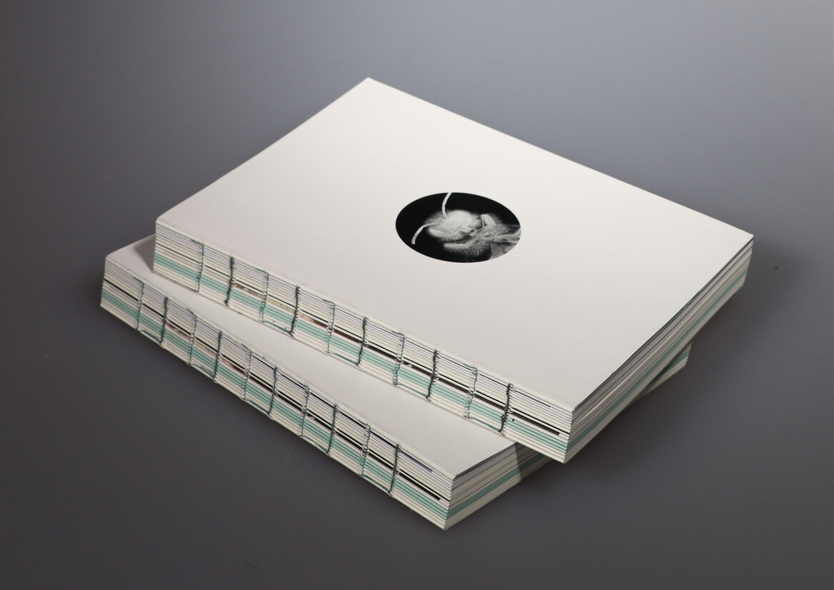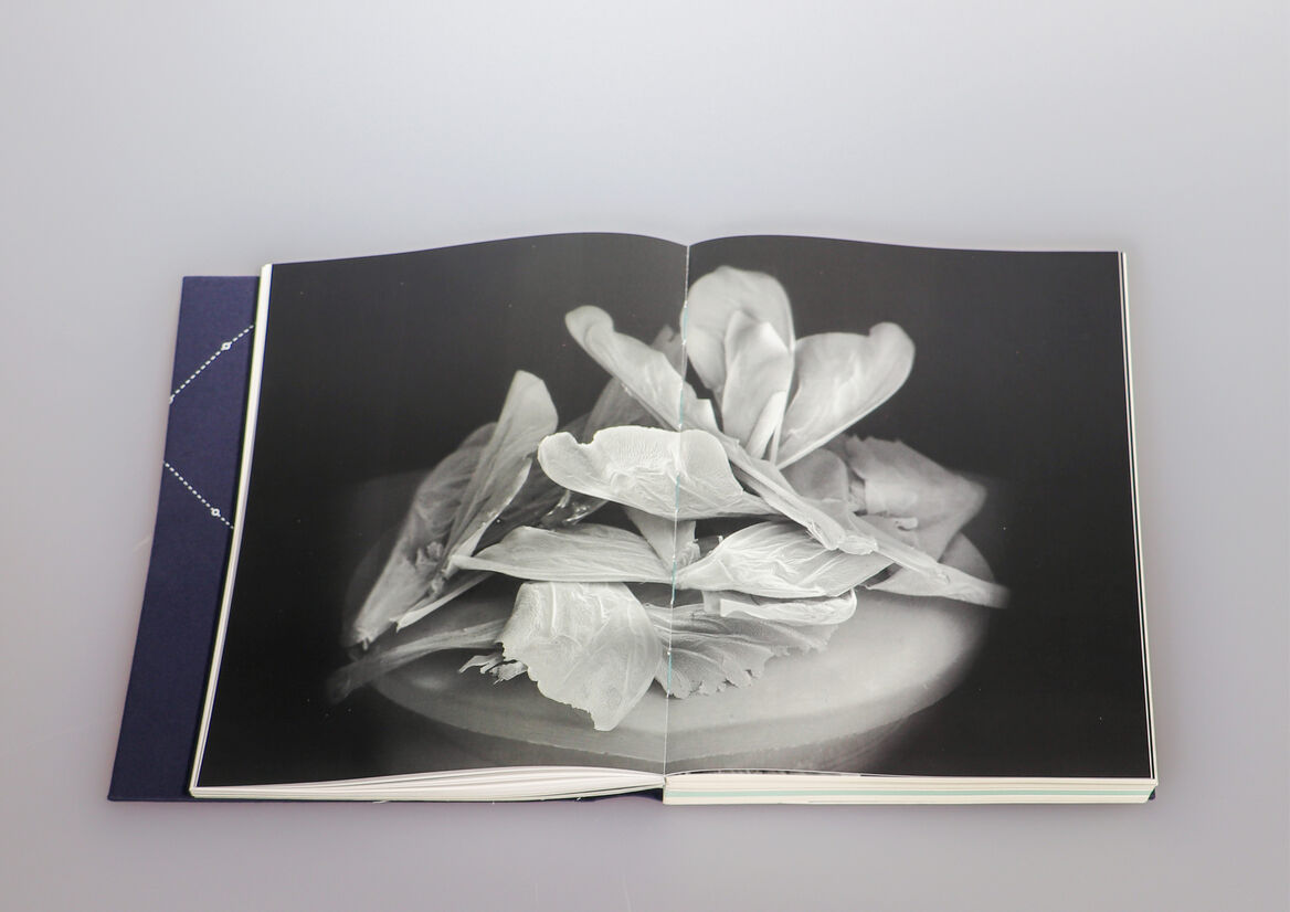 The coptic binding makes visible the interior mechanisms of the book assembly. This is appropriate for a work built out of an open process of creation. It comprises multiple paper stocks, using high gloss for the opening photographic work. The cream stock avoids garish white, with a screen printed sakura cloth French fold dust jacket encompassing the whole.
