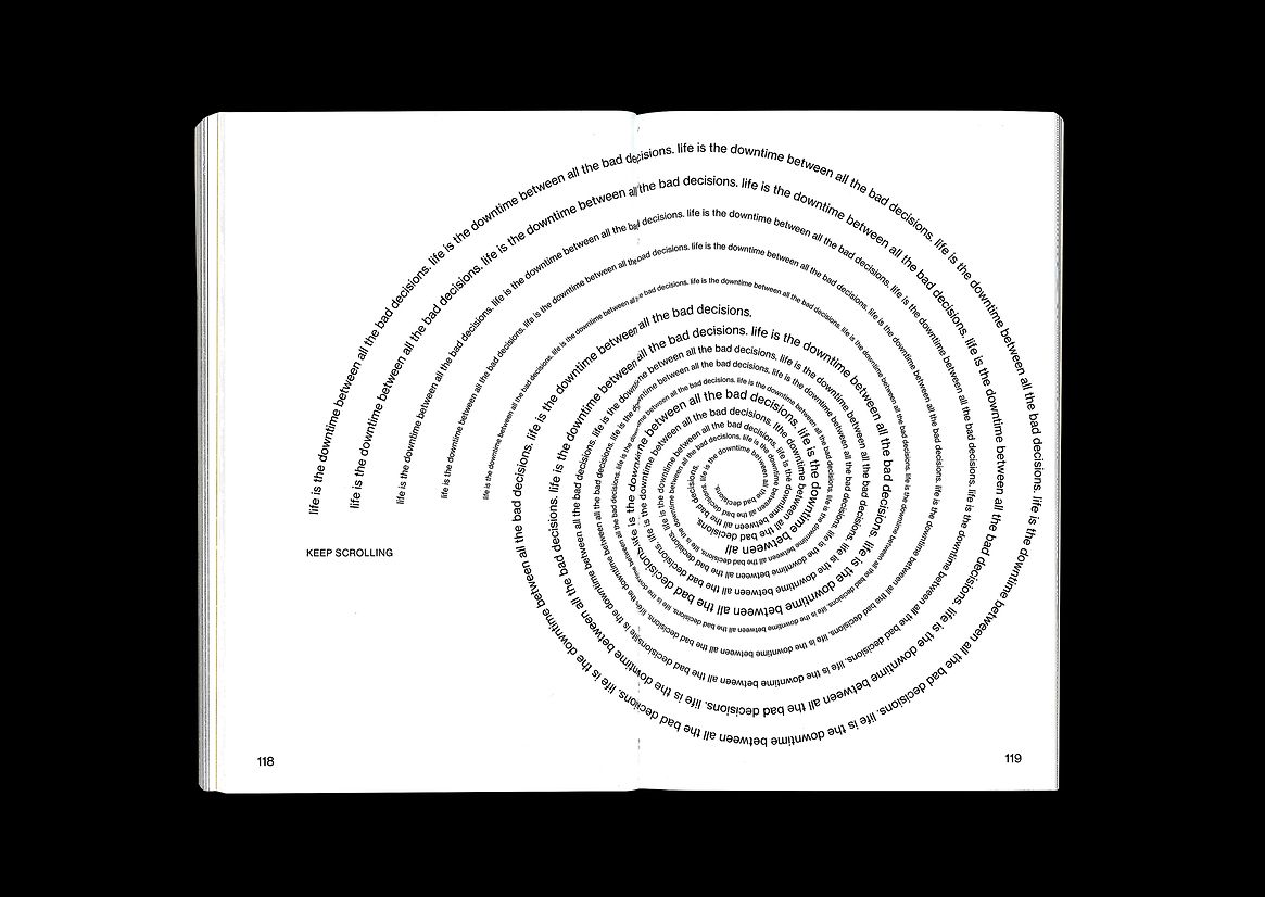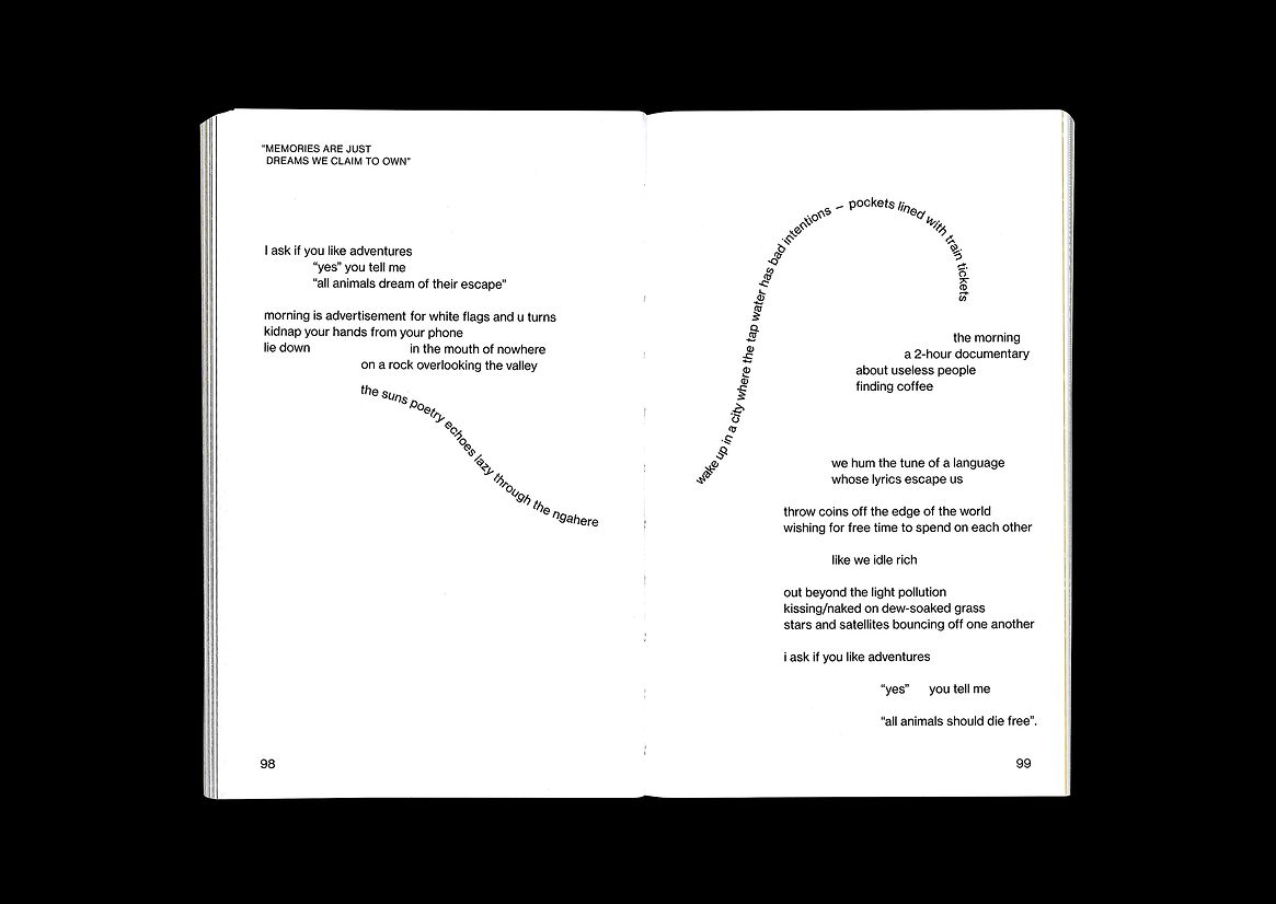 Words are broken up across a line to slow down the pace or tightly packed into a corner giving certain words more importance, poems about grief and love are spread out over multiple pages giving single sentences a sense of weight and importance. A section was flipped to read landscape, text spiraled like its words and they framed a page or filled it.