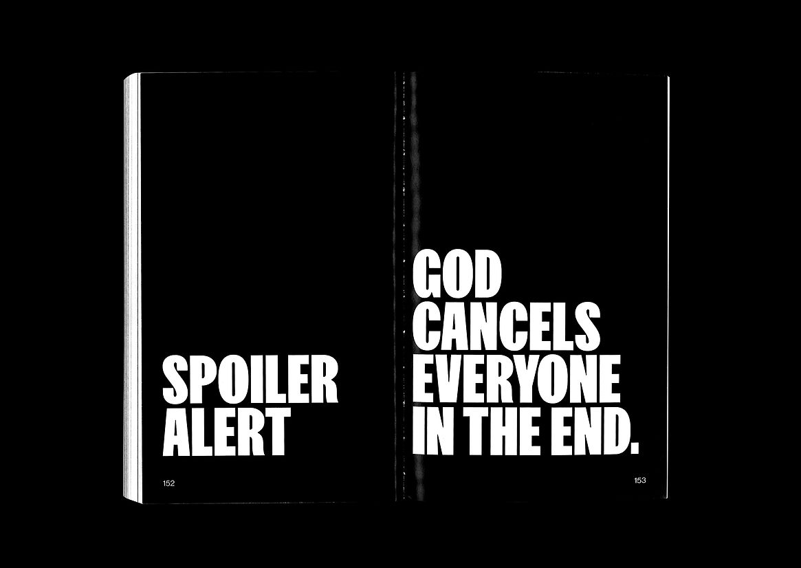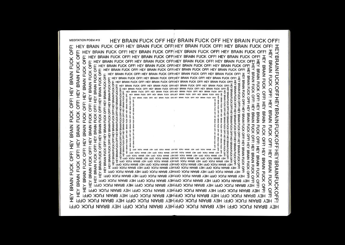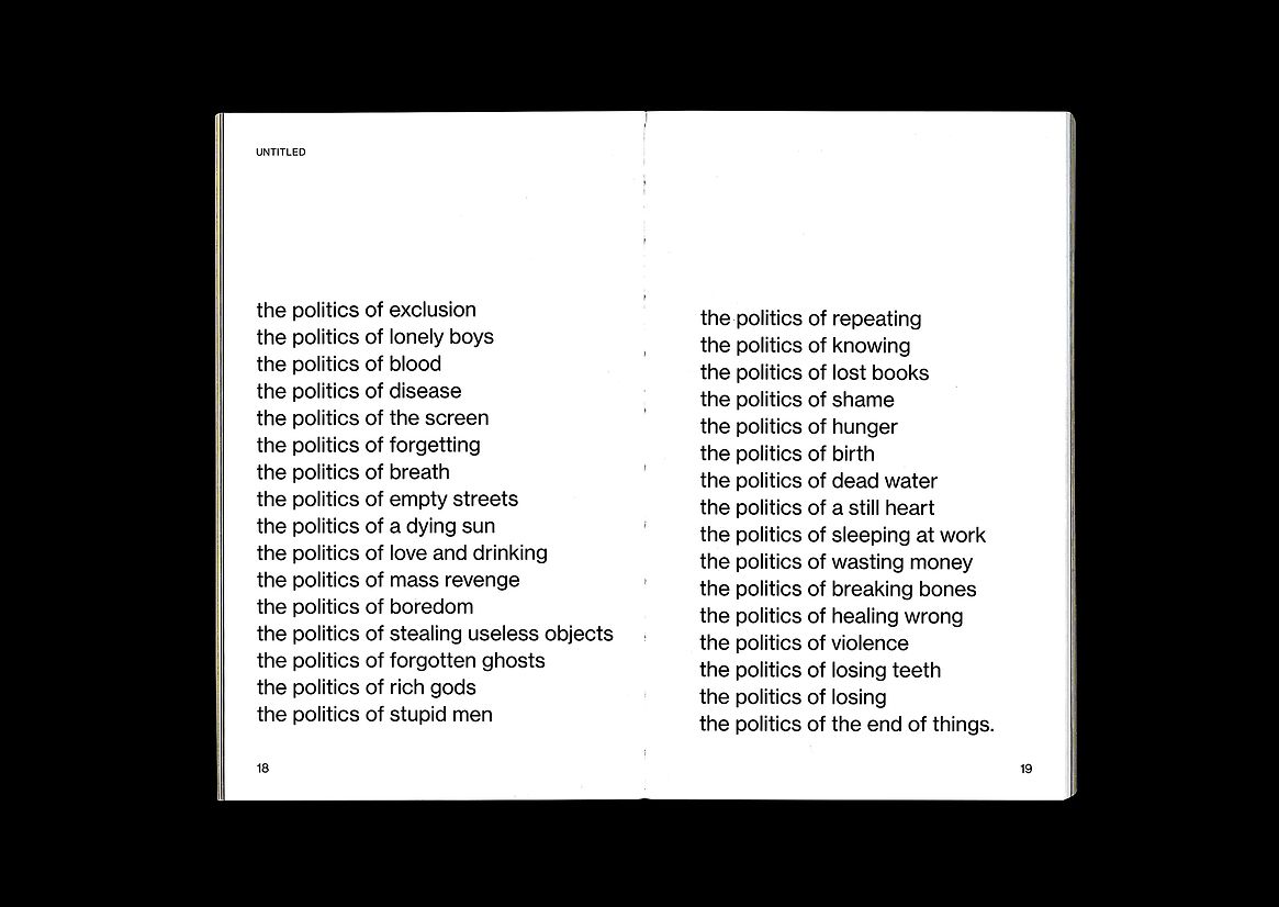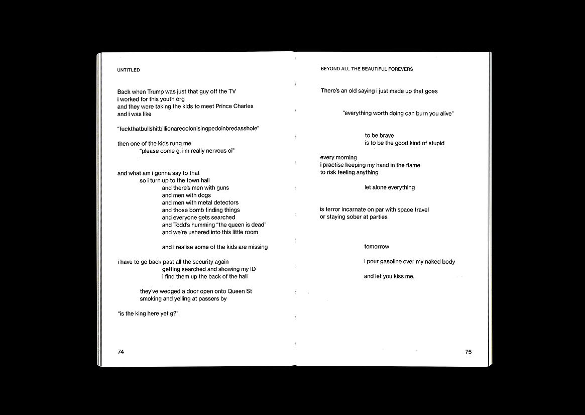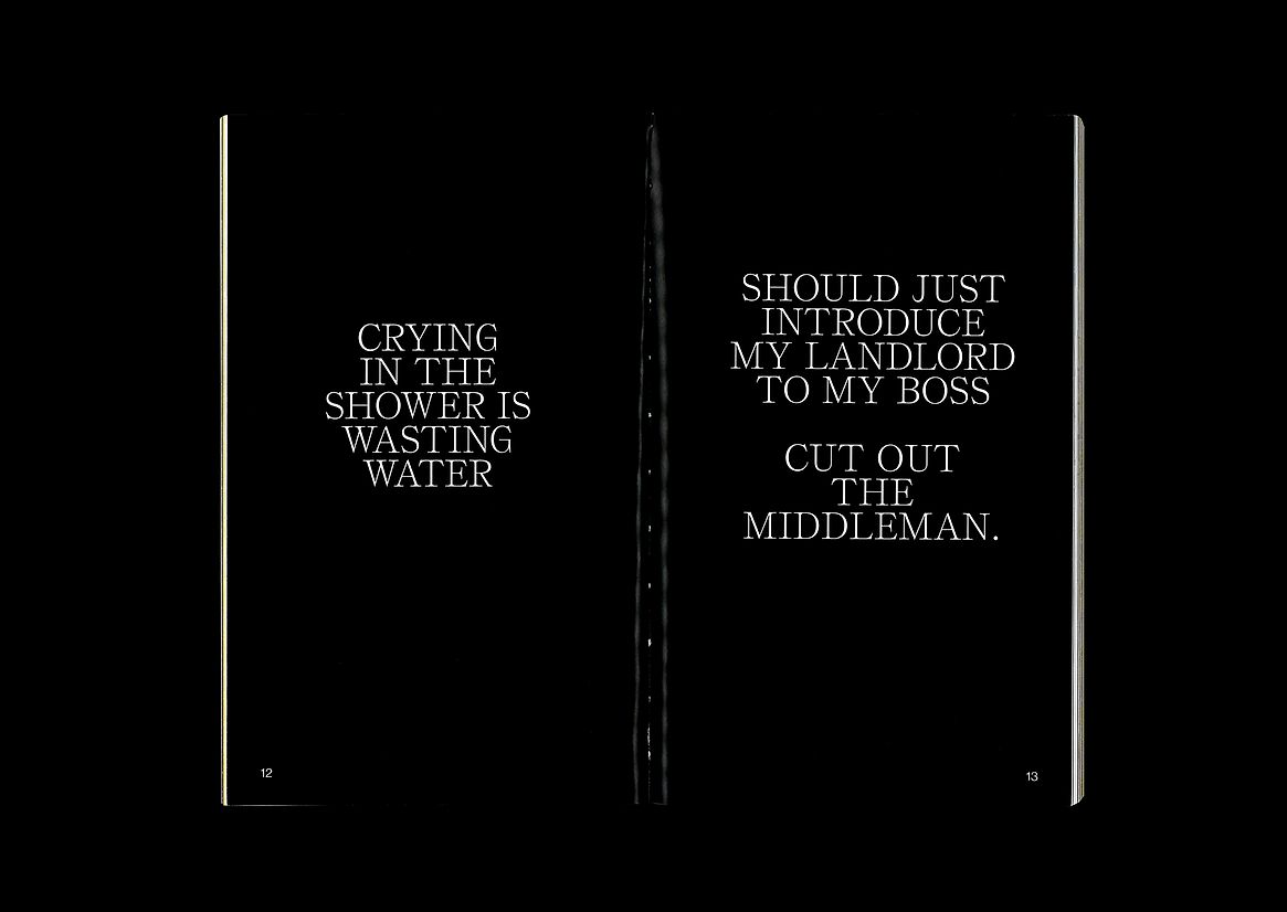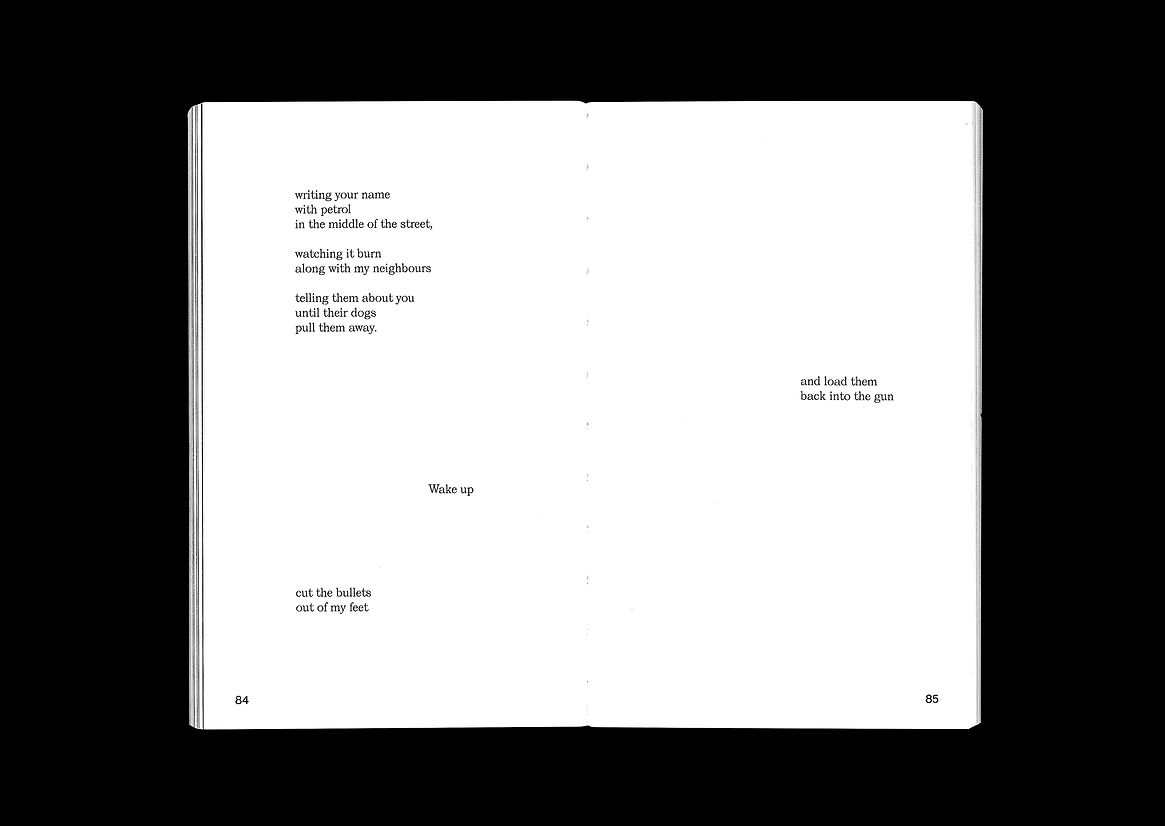 A system was developed to give the book structure and to ensure it still made sense to the reader. A modular grid was used with a heading style and page number so the reader always knew where a poem began and ended. Black was the only colour and the main typeface was a Grotesk sans in 3 different sizes. Each poem was set in this base style and then treated individually so they each had their own sense of identity. Playing with size, tension, and placement on the grid, other typefaces were introduced—a chunky condensed for anything political, a serif for words of grief or love.