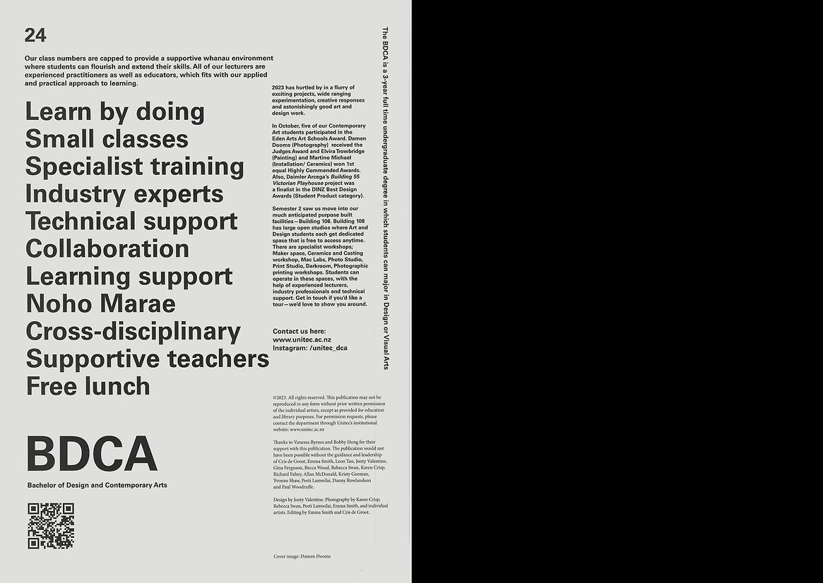 Graphic Business Communication Colour Award Graphics Design Communication Design Craft Editorial and Books Environmental Graphics Large Brand Identity Packaging Self Promotion Small Brand Identity Student & Academic Graphics Animation Digital Film Graphic Moving Image (archived 2025) Product Social Good Award Spatial Toitanga Value of Design Award User Experience Award (archived 2019) All categories Business Communication Colour Award Graphics Design Communication Design Craft Editorial and Books Environmental Graphics Large Brand Identity Packaging Self Promotion Small Brand Identity Student & Academic Graphics All years 2025 2024 2023 2022 2021 2020 2019 2018 2017 2016 2015 2014 2013 2012 2011 2010 Studio A-Z Unitec NZ 2 02 Finalist 2024 Editorial and Books Credits Pou Auaha / Creative Director Jonty Valentine Ngā Kaimahi / Team Members Emma Smith, Cris de Groot Kaitautoko / Contributors Karen Crisp, Danny Rowlandson Client Unitec School of Creative Industries