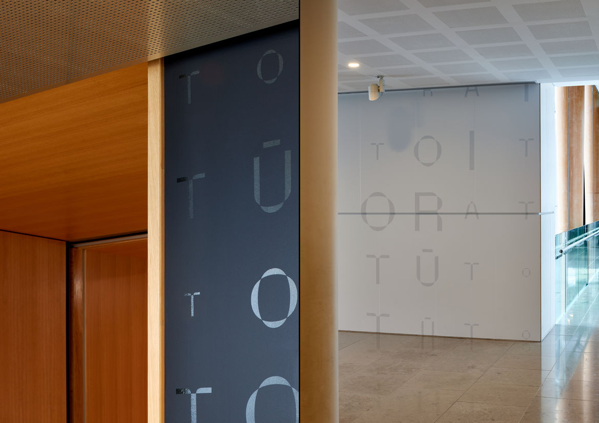 At the gallery, the graphics are informed by the Māori conceptual frameworks inherent in the architecture. Standing at the outside foyer, we are between kauri columns and the canopy in the realm of Tāne Mahuta. Here, on the exterior glass facade, the show's title becomes a collage of subtle dappled leaves.