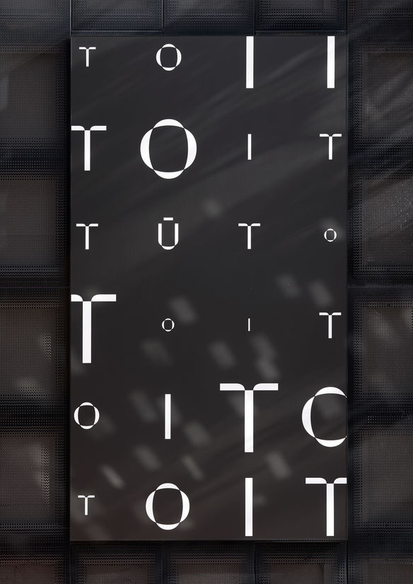 Inside the ground floor entrance, we are in the realm of Papatūānuku, and entering Te Kore the exhibition’s first space, plunging into the darkness of the great nothingness. Here, our typographic pattern takes the form of gloss black letters sparkling against a porous black wall.