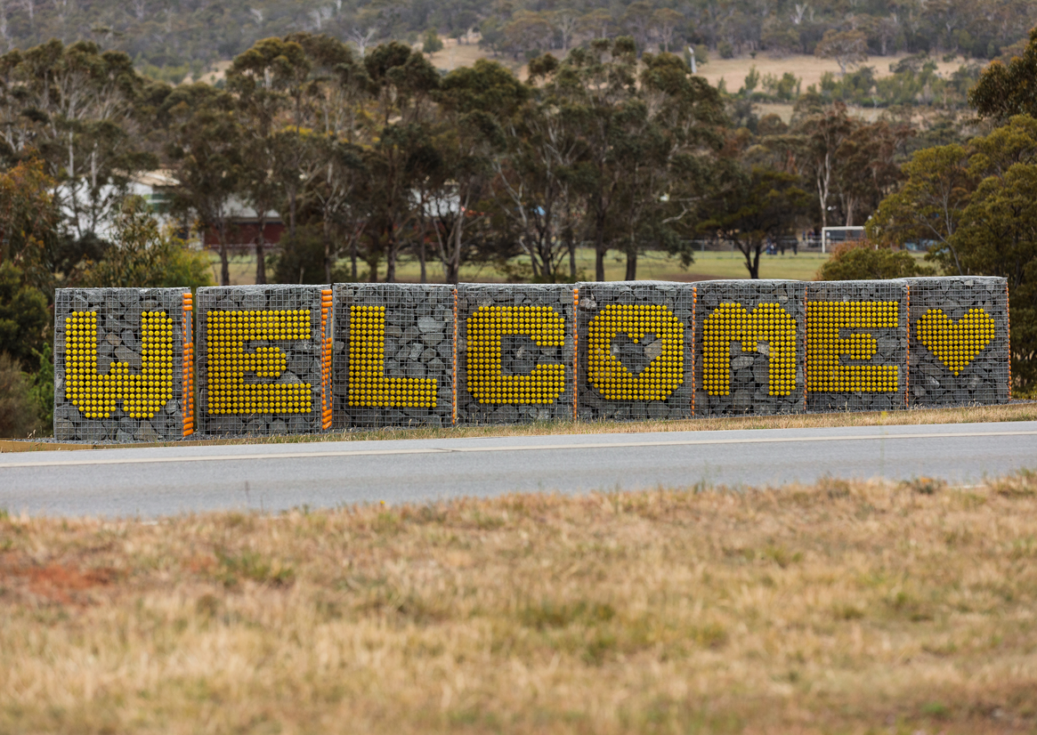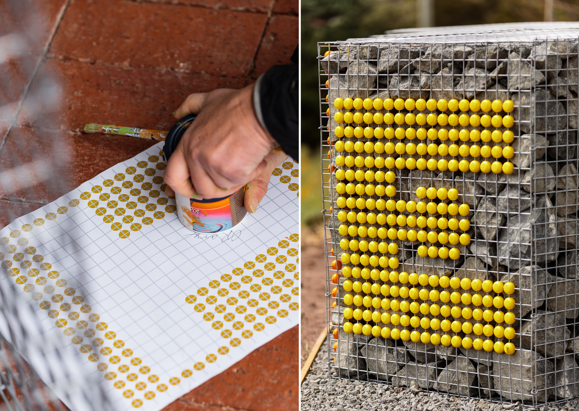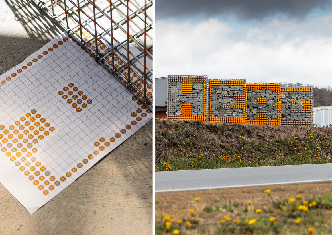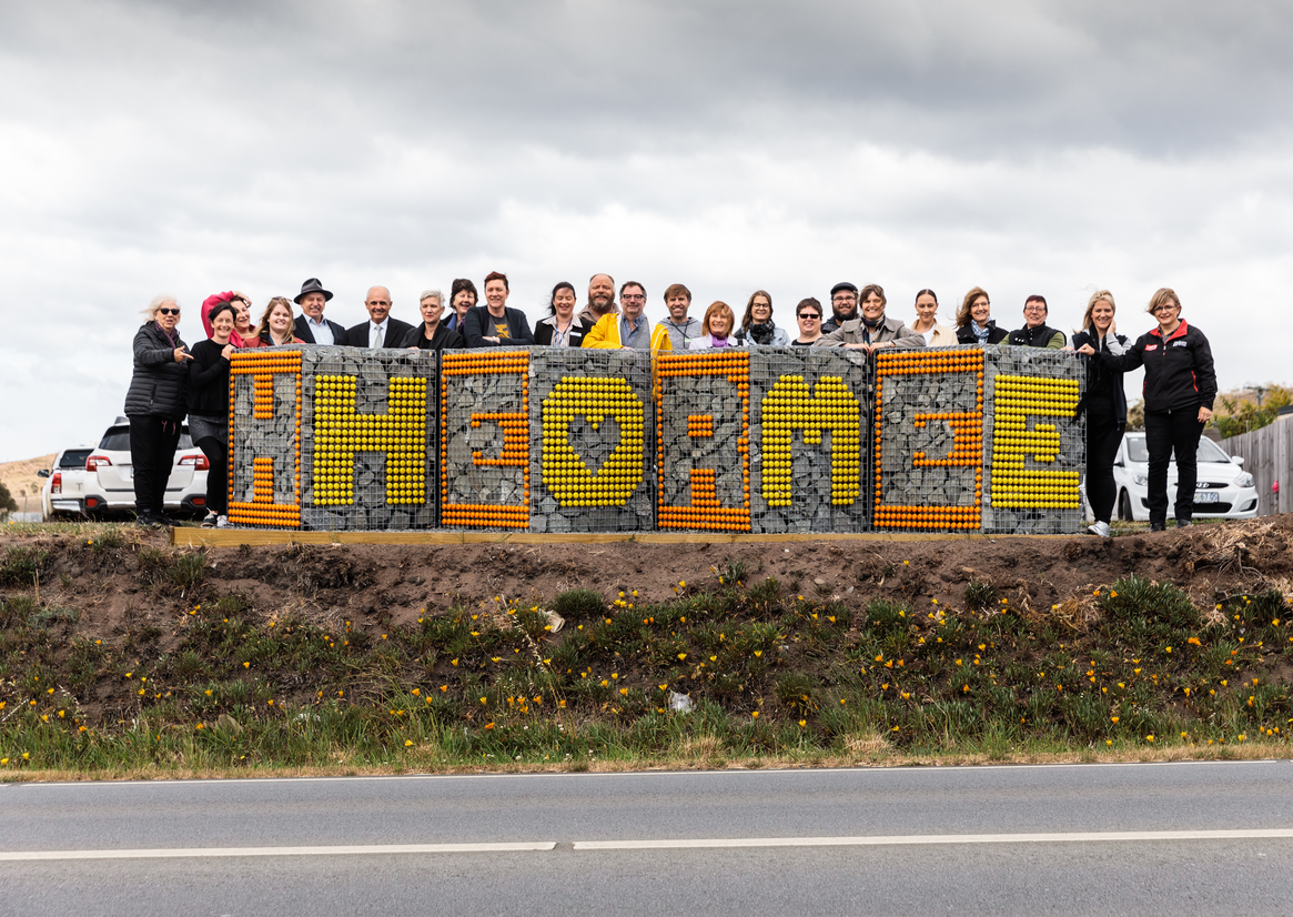 The collaborating designer travelled from Alaska to work with the community in constructing the work, which took place over a couple of weeks. The final work consists of 12 gabions and 4 words & 12,000 DeDots, which when driving past reads HERE, TOGETHER, WELCOME, HOME.