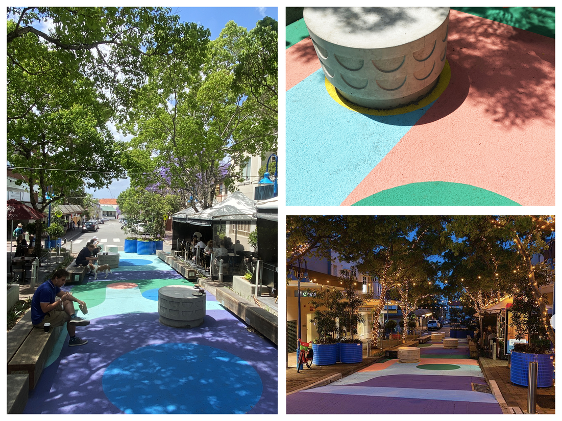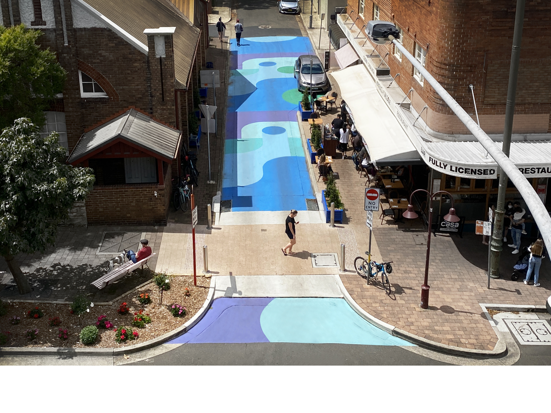 This project involved the temporary transformation of Kirribilli's Burton Street from a busy, congested road into a peaceful mini-plaza, complete with new furniture, planters and lighting, and a striking colourful design scheme. The project was developed as a quick turnaround public space activation to address post-Covid lockdown issues, increase outdoor trading for cafés and restaurants, and make a new community node for gathering and interaction.