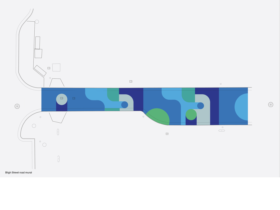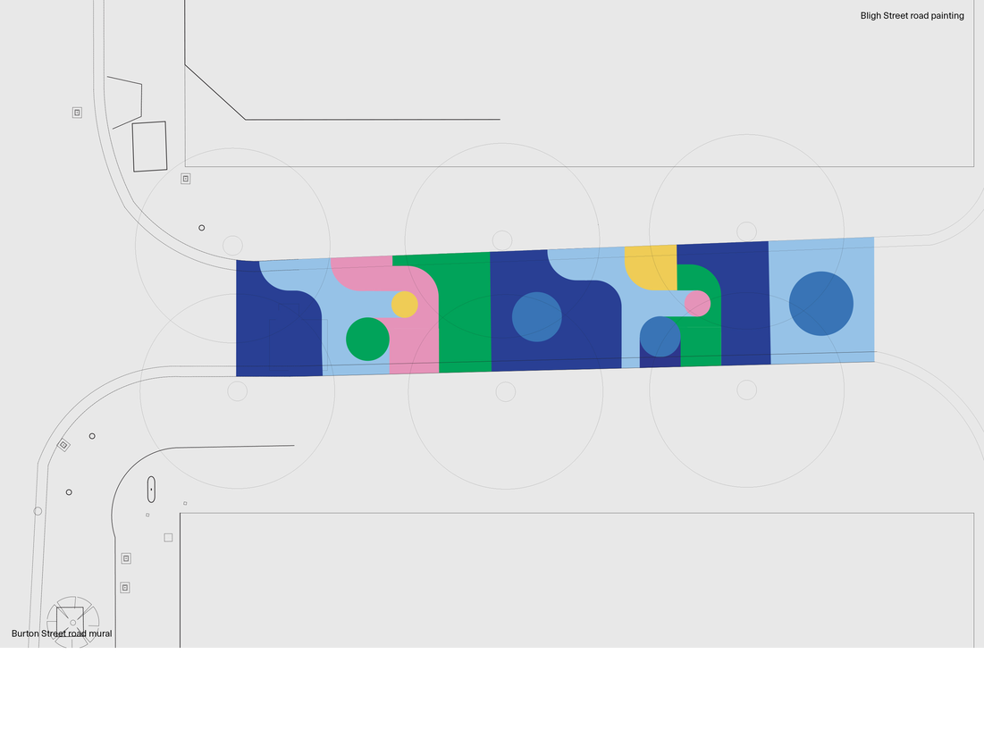 Kirribilli was named after 'kiarabilli', a First People’s word that means 'Good fishing spot'. This informed an energic and vibrant visual language that explored an undersea world. The language was expressed in lighting, bollards, landscaping, planters, furniture and two road murals in the closed-off streets (Burton and Bligh Streets).
