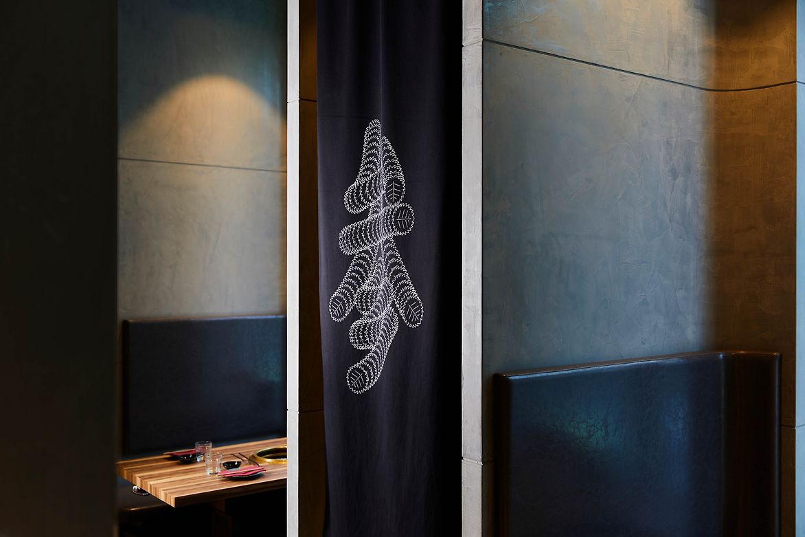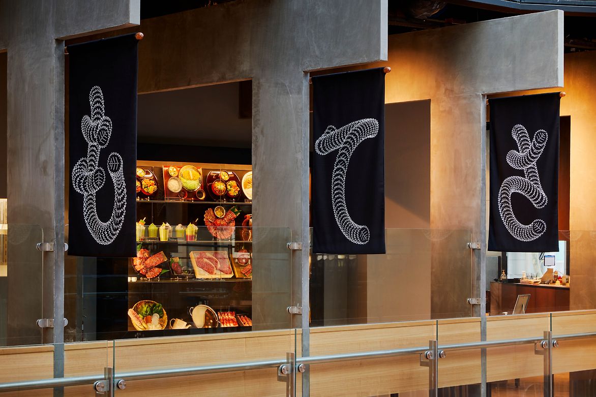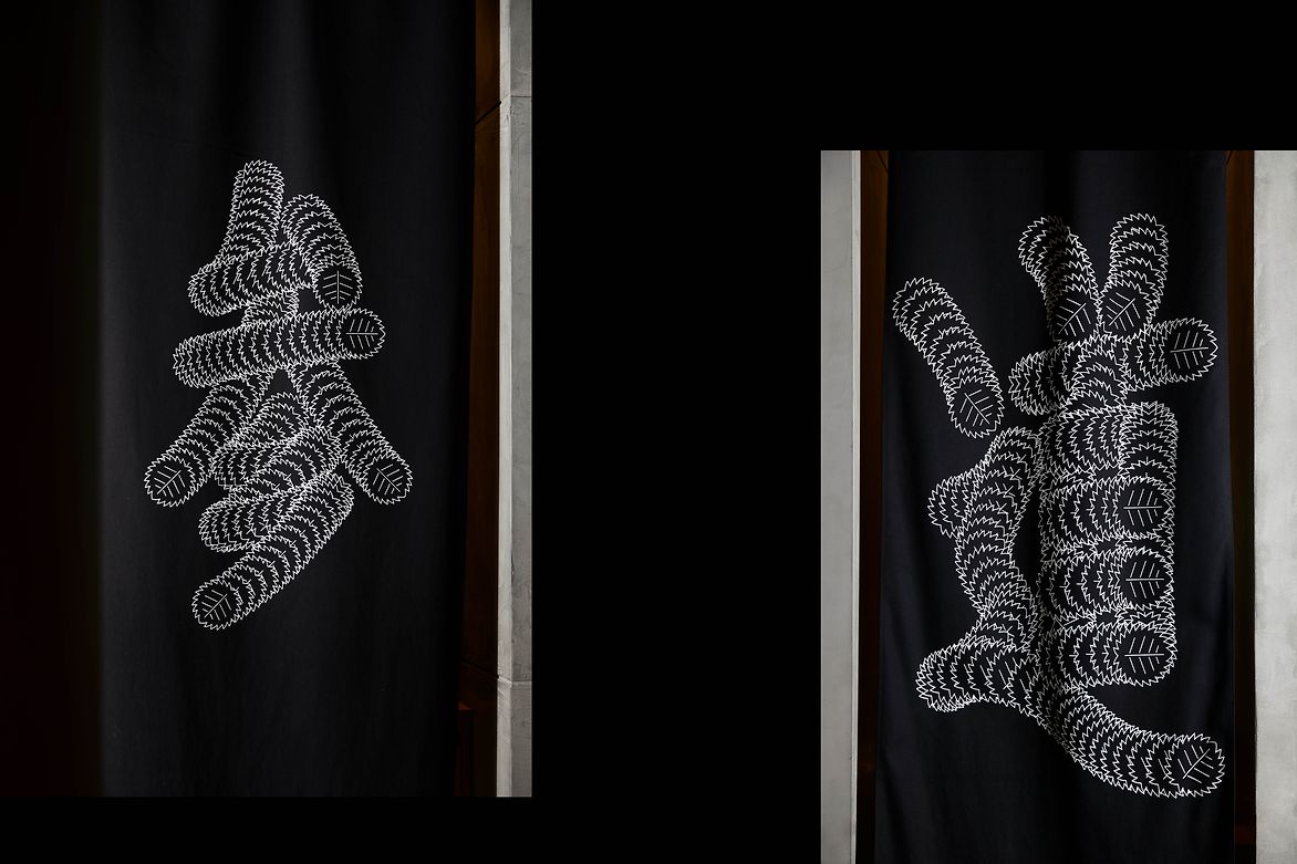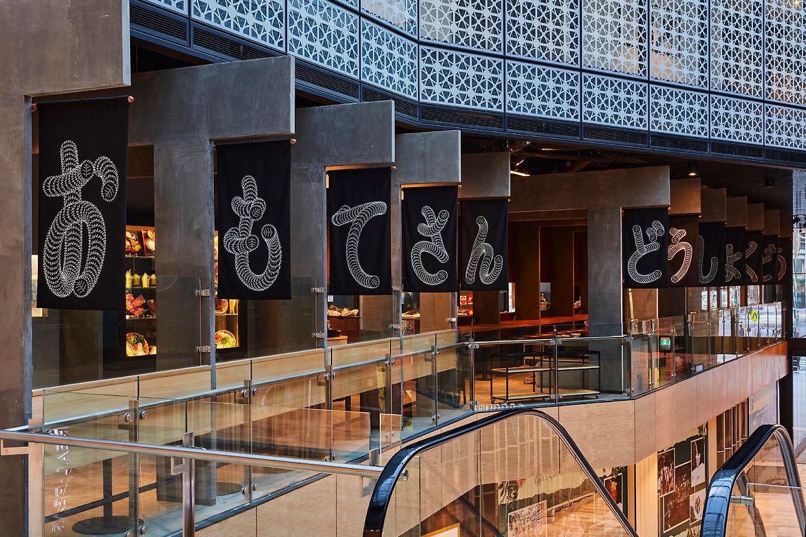 The new Omotesando restaurant on Miller street in North Sydney evokes the spirit of its Japanese name-sake with its tree lined street below and Japanese food and atmosphere. Being on Omotesando means being under the Japanese Elms – Zelcova Serata Makino – to represent the act of falling leaves a stylised leaf traces the path of the Japanese letters. The letterforms were then screen printed in stark white on black canvas and made in to a set of flags and curtains to spell out the name of the restaurant.
