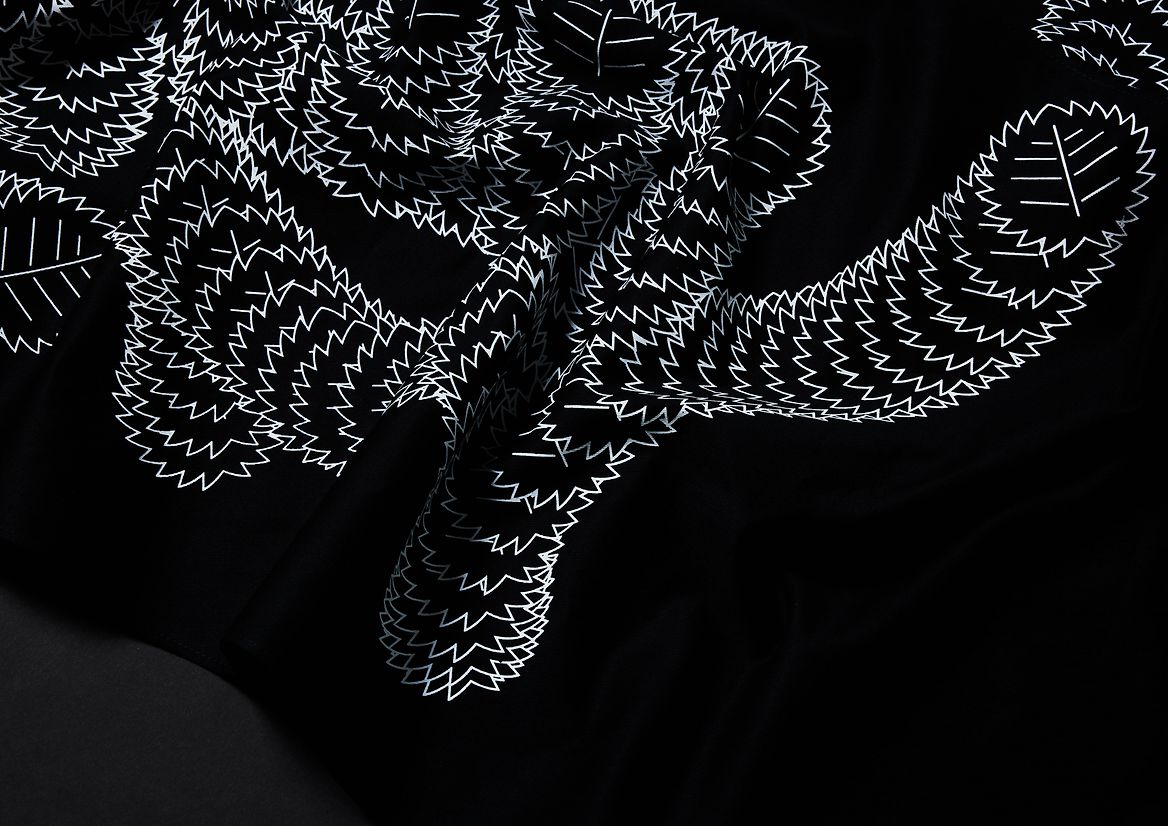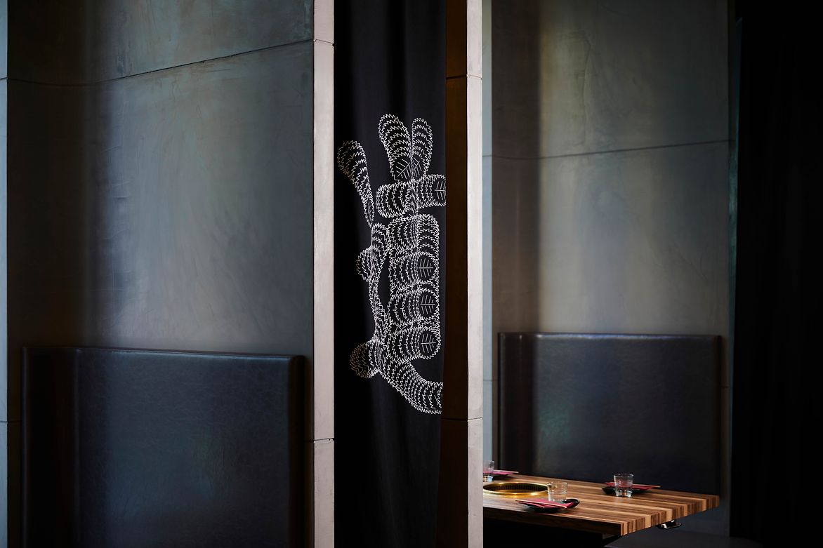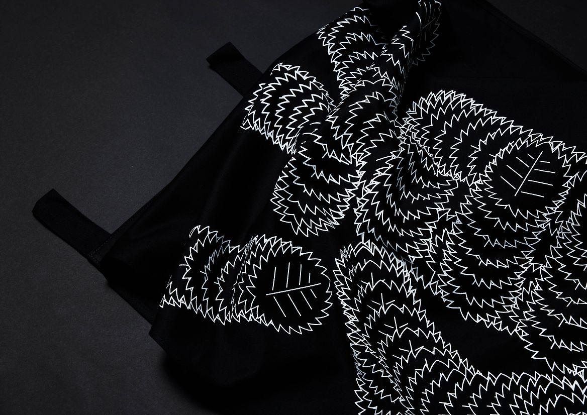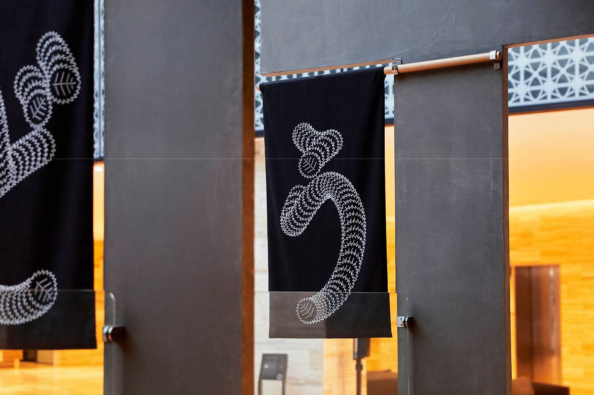 The new Omotesando restaurant on Miller street in North Sydney evokes the spirit of its Japanese name-sake with its tree lined street below and Japanese food and atmosphere. Being on Omotesando means being under the Japanese Elms – Zelcova Serata Makino – to represent the act of falling leaves a stylised leaf traces the path of the Japanese letters. The letterforms were then screen printed in stark white on black canvas and made in to a set of flags and curtains to spell out the name of the restaurant.