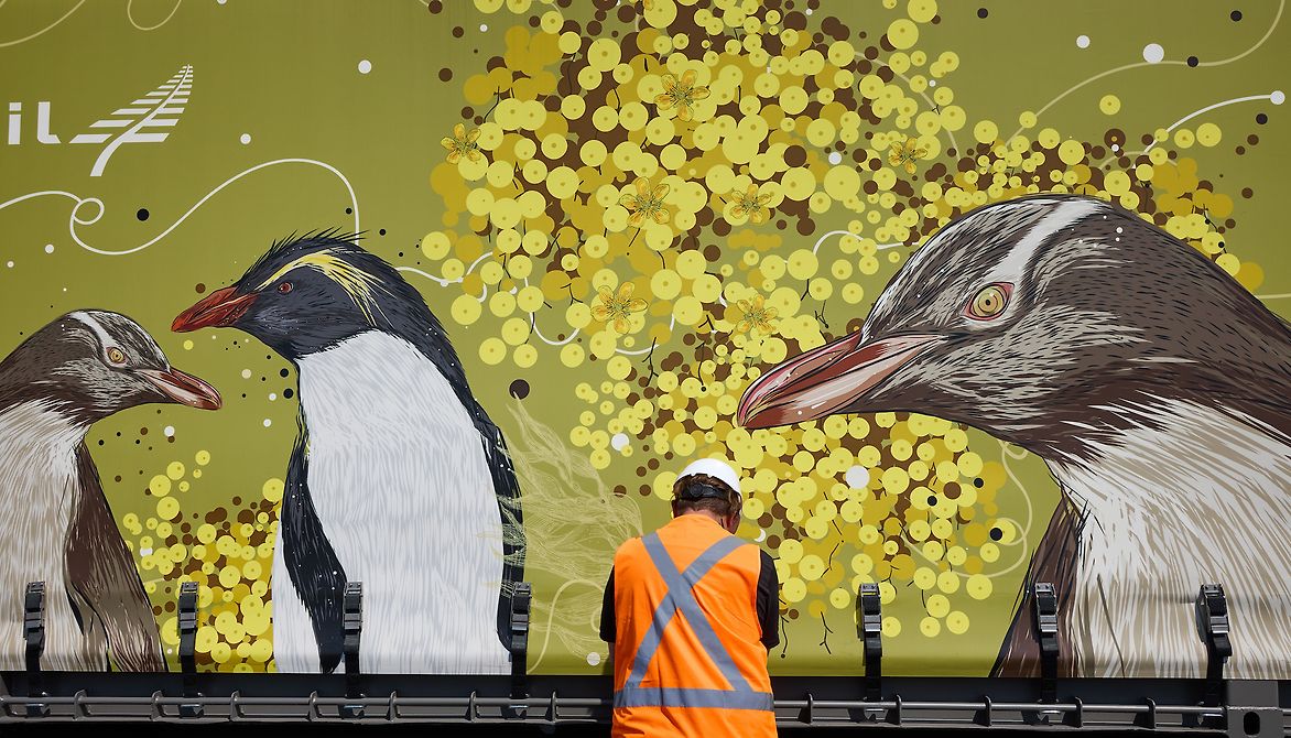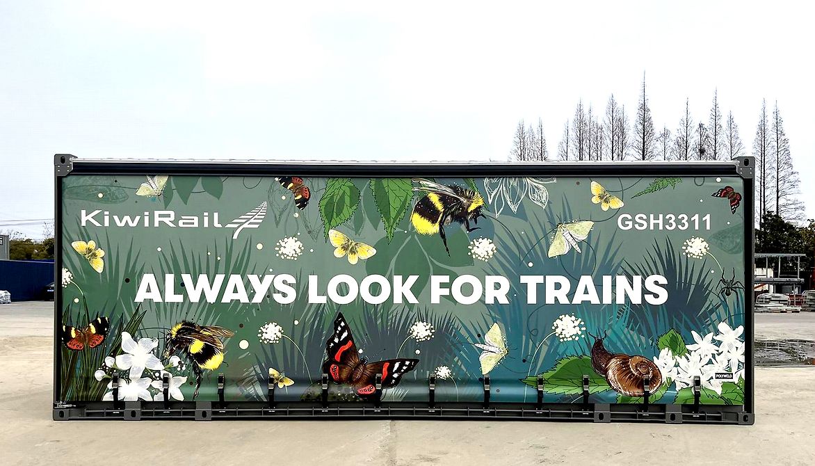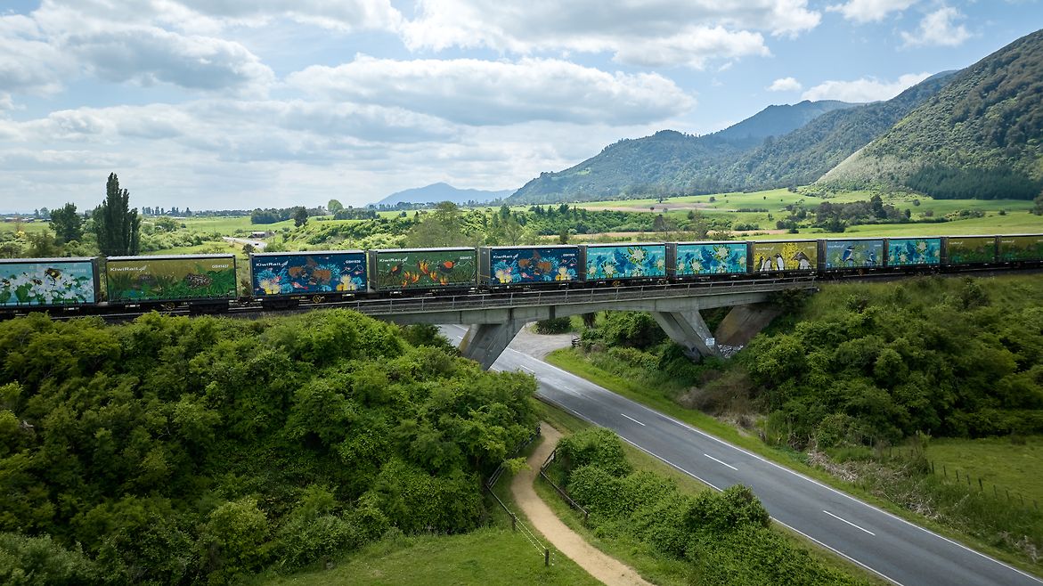 Our freight trains travel through nearly all parts of the country and across both islands every day. With each freight container 25-feet across and 9.5-feet tall, they offer a massive opportunity for showcasing large design pieces across New Zealand. We realised there was a potential for thousands of people to see environmentally focused designs travelling against a backdrop of New Zealand’s natural scenery every day, deepening the connection between the rail industry and the natural environment.