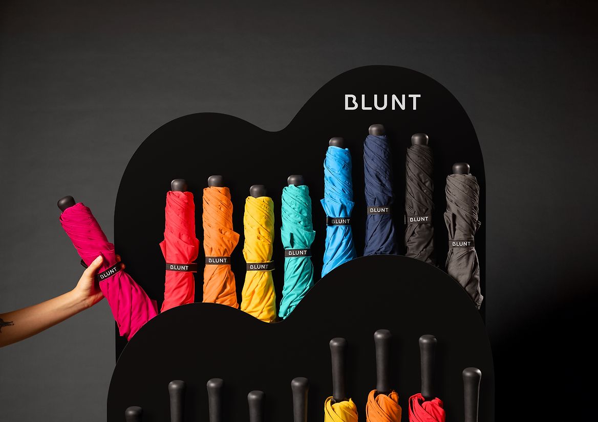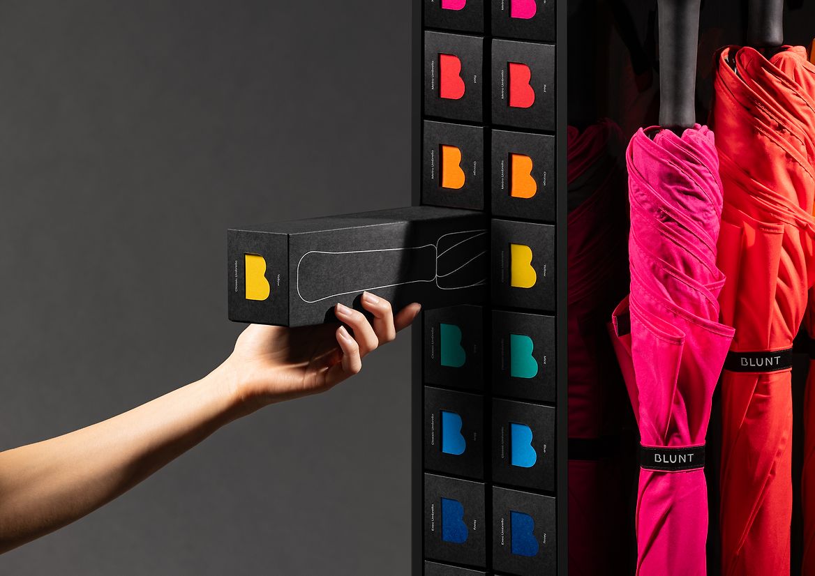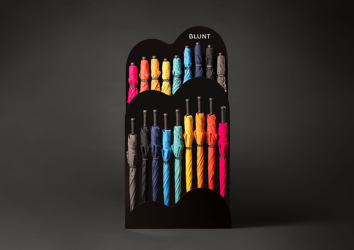 For impact, we purposefully kept the umbrellas out on display creating a rainbow and encouraging consumers to see and experience Blunt in a more tactile, sensorial way. But we purposefully crafted the system in alignment with the packaging to be stored inside the stand, where consumers and retail staff can easily reach from the ends of the merchandising system. The end of the packaging gives consumers the perfect way to identify and select the colour and model, and gives Blunt the ability to have a lot more stock on the shop floor.