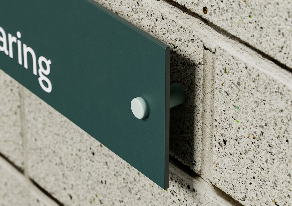 Signage adapts to its location by scaling up or down to suit architectural qualities such as the brickwork grid. Honest, visible fixings and a text-based system create a unified wayfinding language.