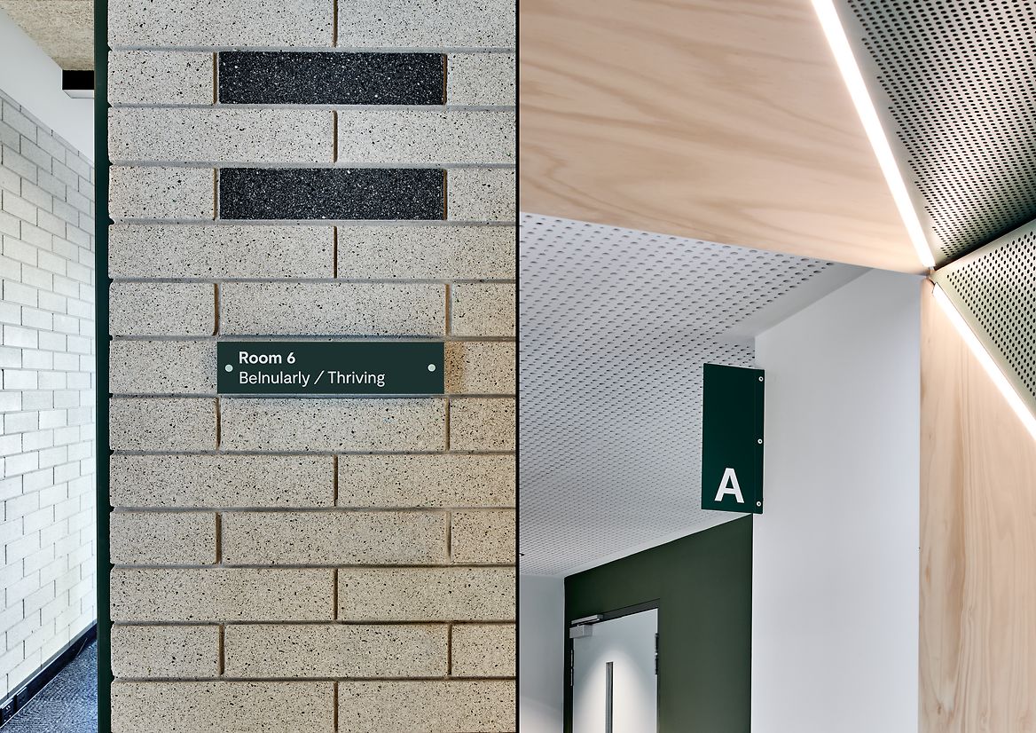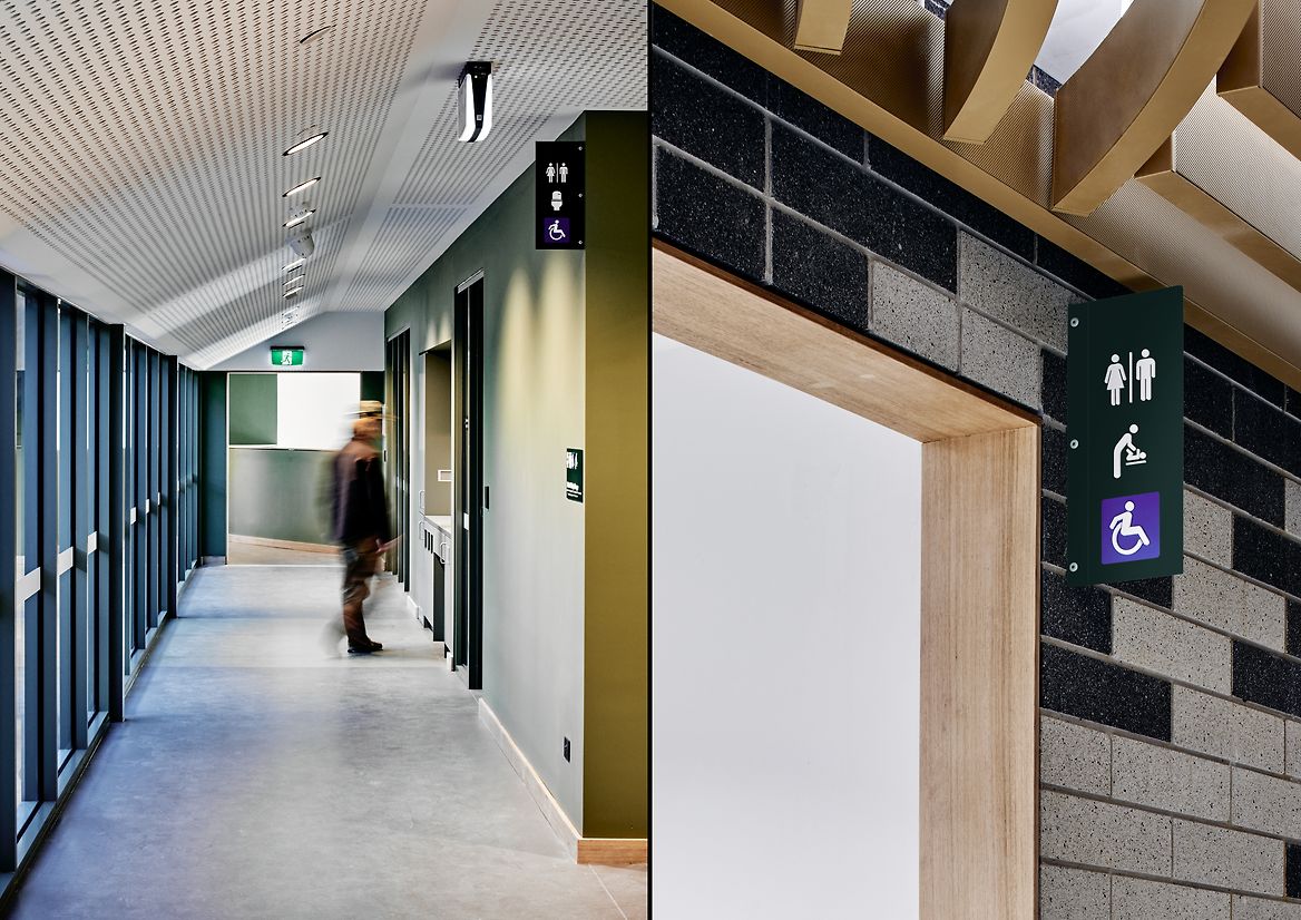 Championing the honest and sustainable architectural design, the signage references the rich interior colour palette and crafted details for an honest and robust system that is well integrated into the fabric of the building.