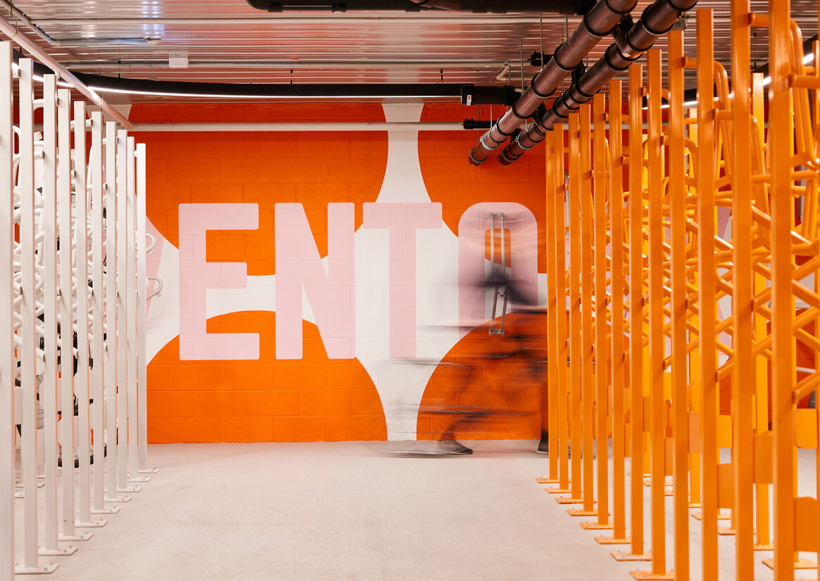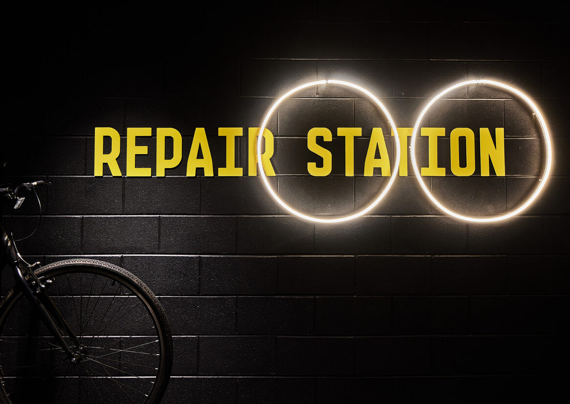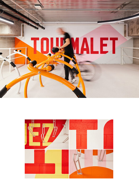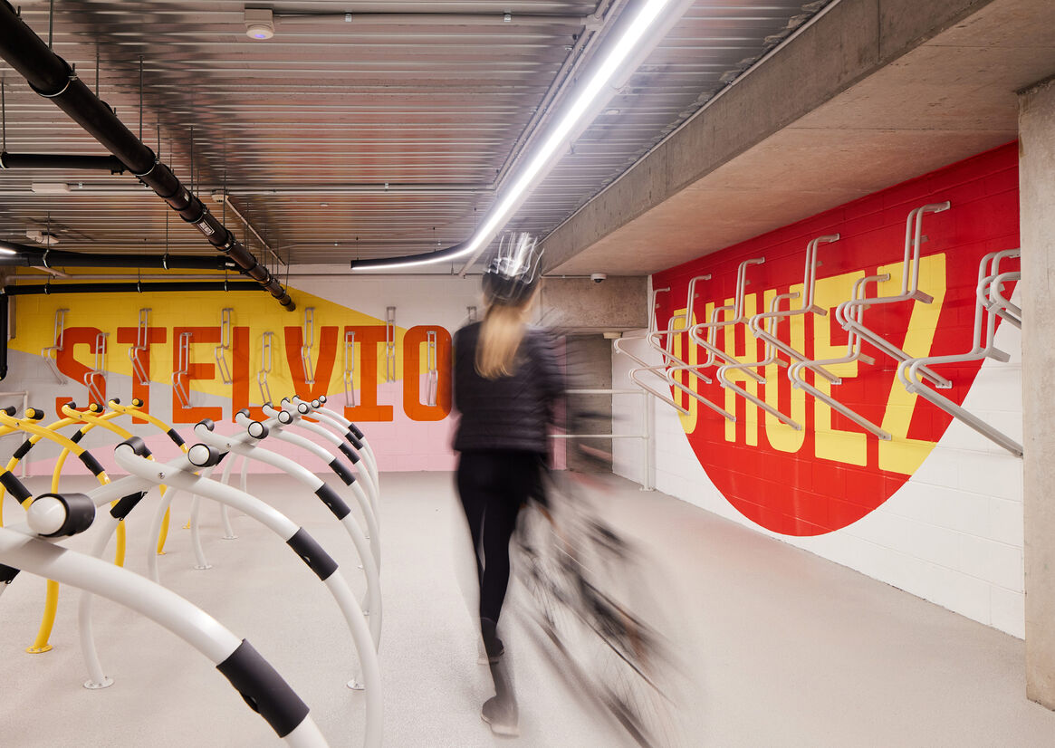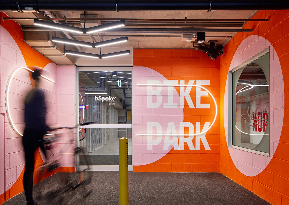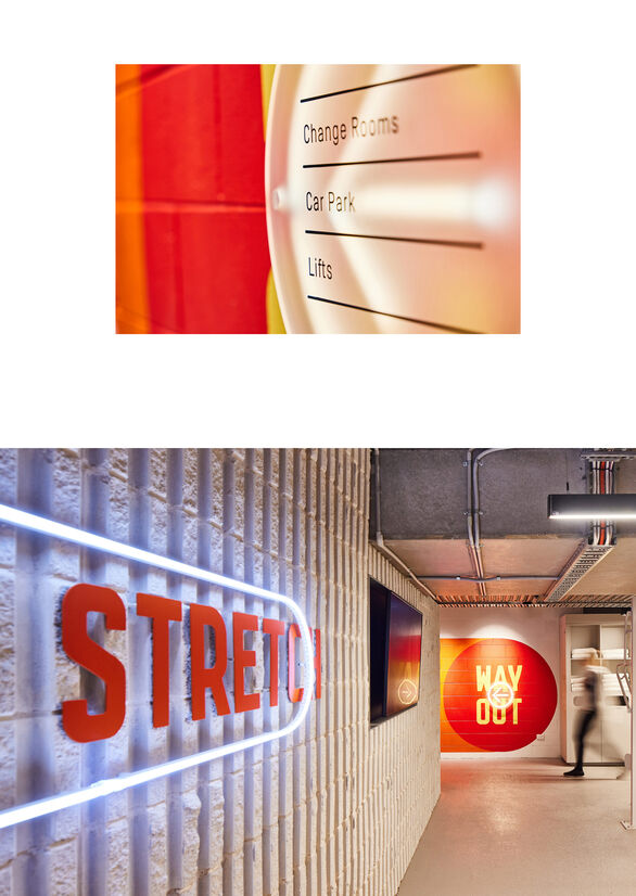 Illuminated signage is provided at key destinations, helping to provide some intuitive wayfinding cues for users and adding an eye-catchng layer of illumination in the underground spaces. Bold graphic statements also provide wayfinding information within the circulation spaces, helping to thread together a series of spaces across multiple floors. The end result is a vibrant and cohesive system that honours the pinnacle of the cycling peleton, whilst creating a thriving playground space for the local community.