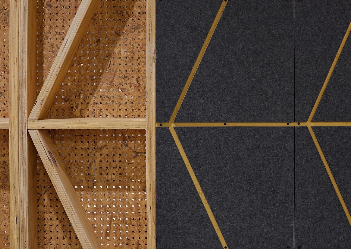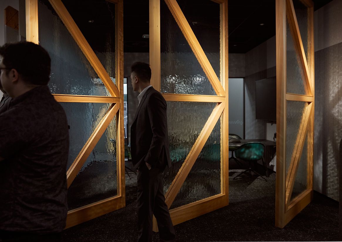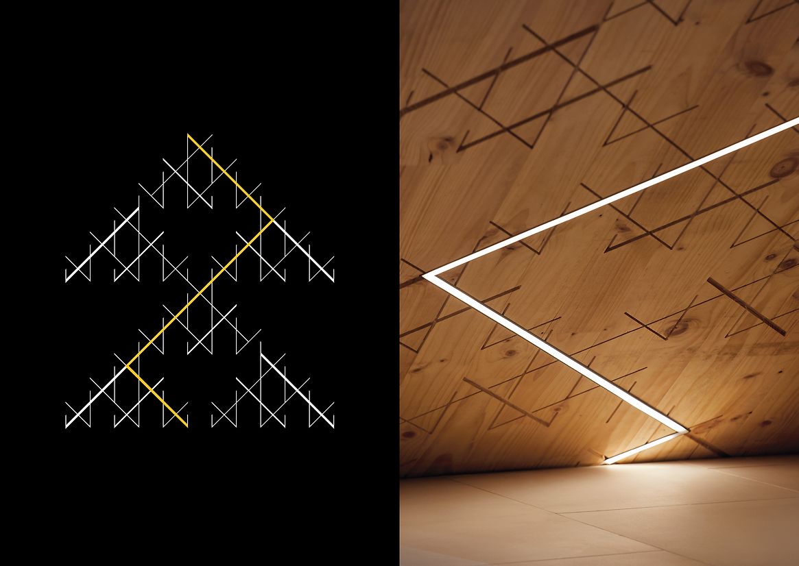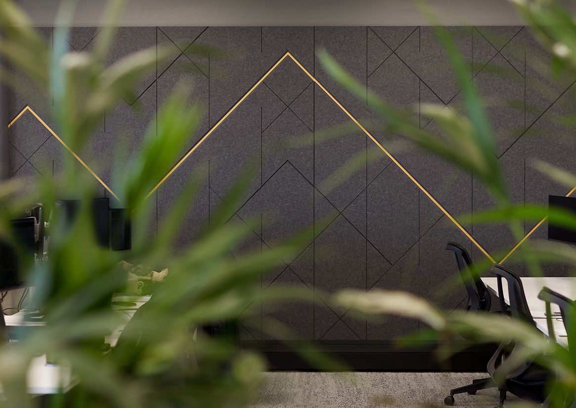 The pattern is modular by design, allowing for a variety of unique arrangements and scales to be explored in application. It finds form on the underbelly of the feature stair, on feature wall finishes and incorporated into the bi-lingual wayfinding signage and the glass manifestation. An intertwining golden line was introduced that manifests as an LED strip light or as a feature yellow colour between wall finishes. It acts as the connective thread of Aurecon, taking a non-linear path or going against the grain.
