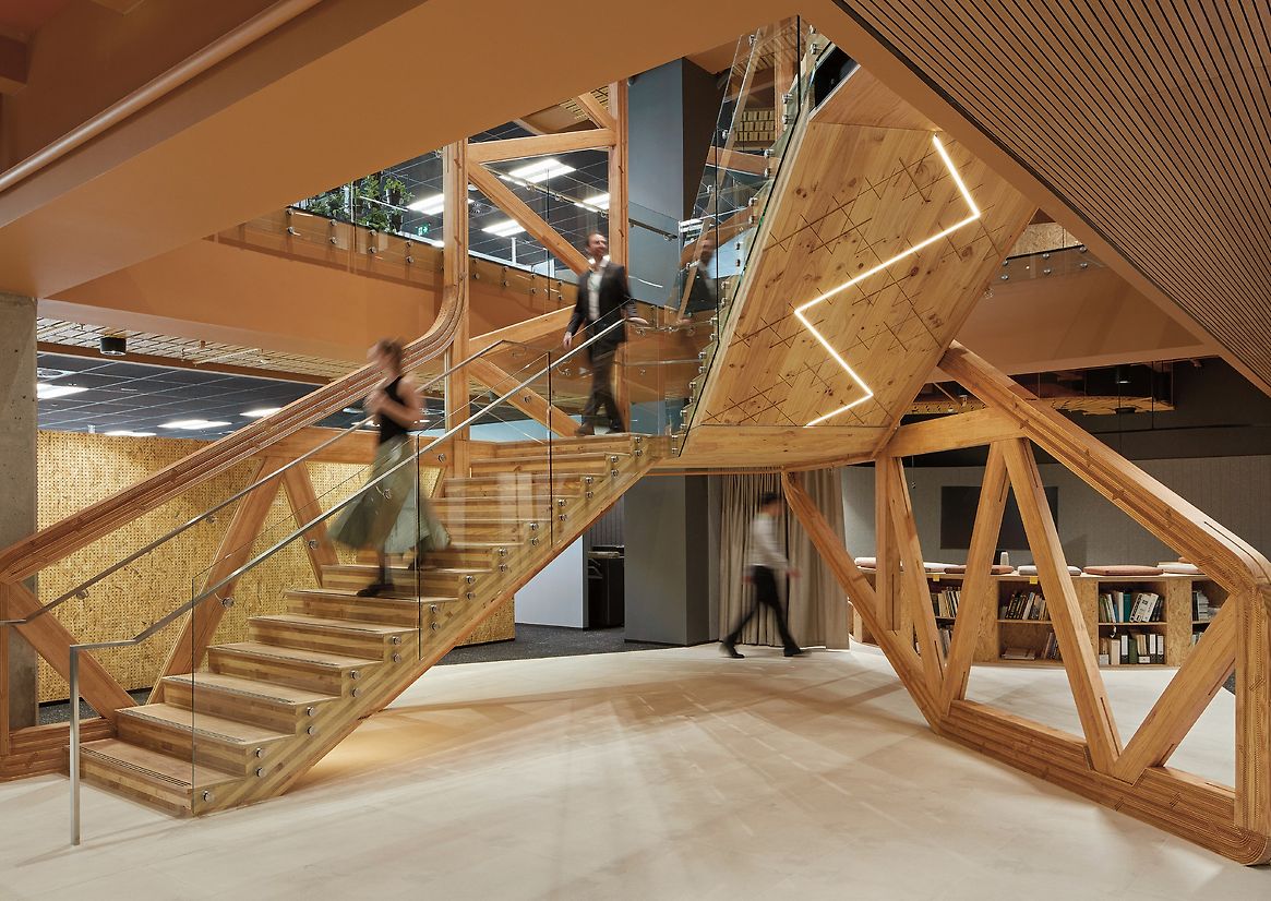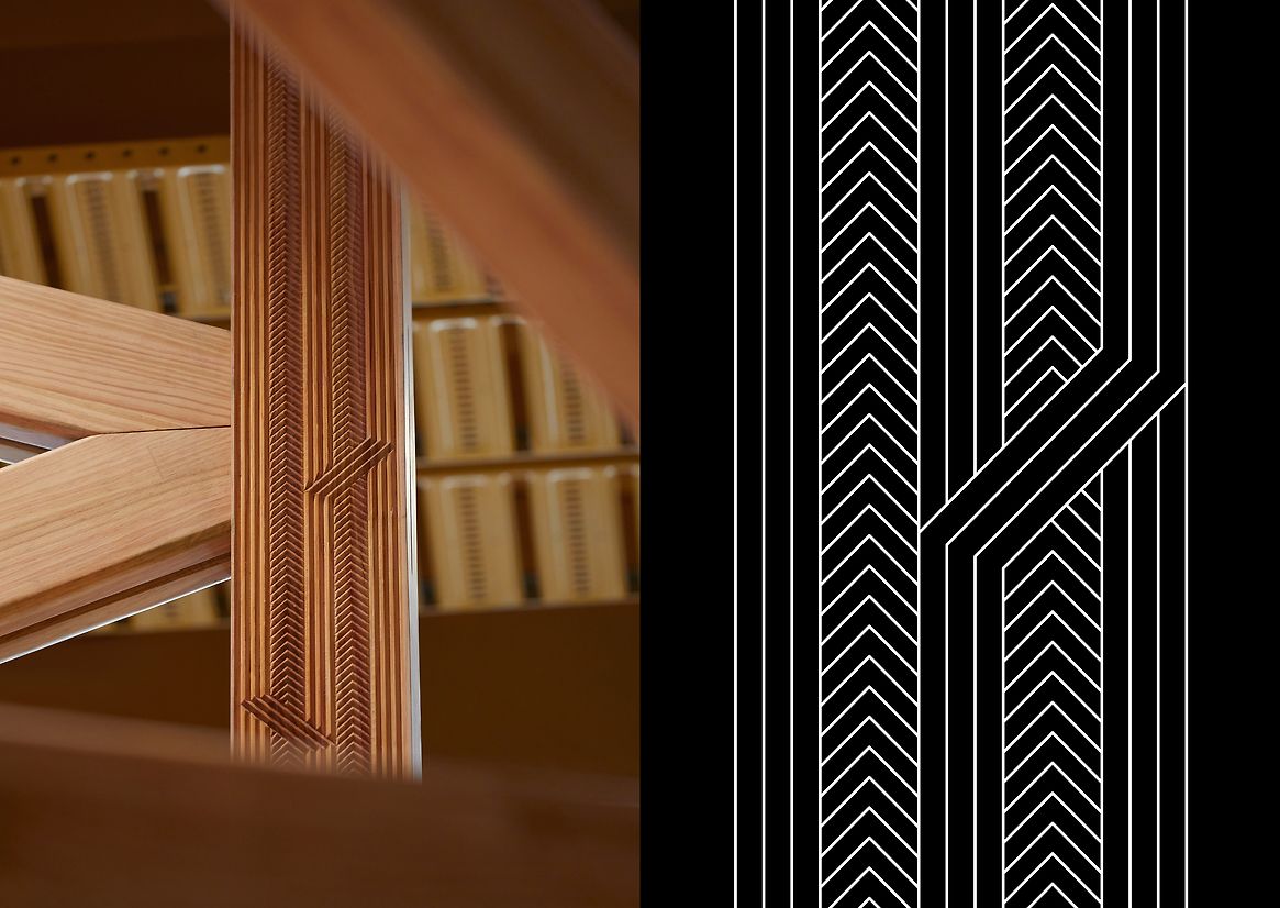 The stair design takes the form of a taurapa – the stern of a waka. The truss is adorned with a unique aukaha pattern co-created especially for the project. The aukaha are the bindings that strengthen and increase the performance of the waka as it moves through the water.