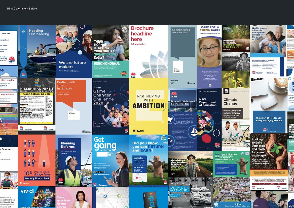 Prior to this transformation, NSW Government was responsible for managing a large portfolio of departments, initiatives, brands and sub-brands — each with a multitude of individual brand systems. Managing these diverse brand expressions required a disproportionate amount of time and resources, and increased the complexities of Government interactions. To better serve its geographically and culturally diverse population (27% of whom speak English as a second language), NSW Government required an identity system that was flexible enough to accommodate the complexity of their needs, yet simple enough to be implemented by over 4000 people — many of whom had limited design experience.