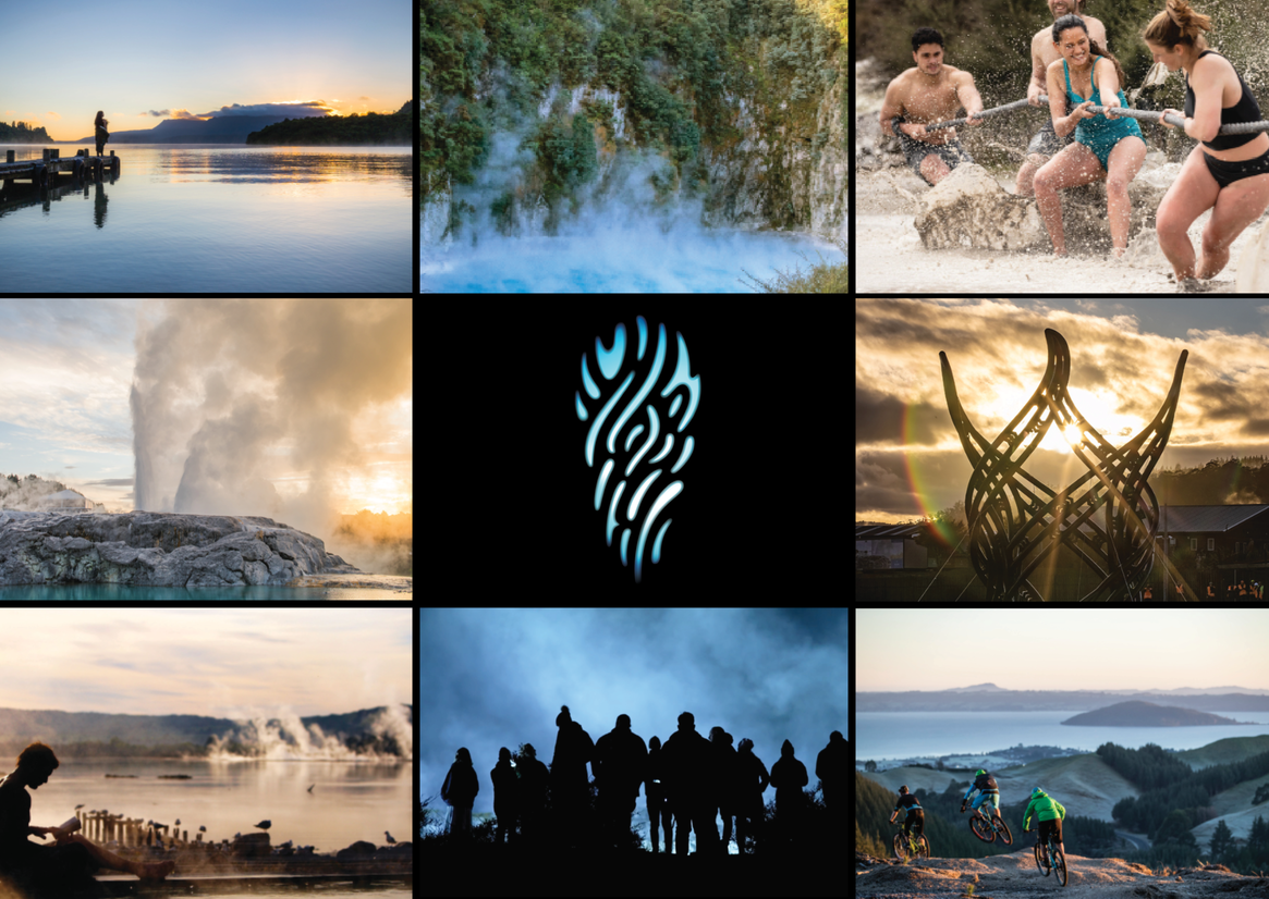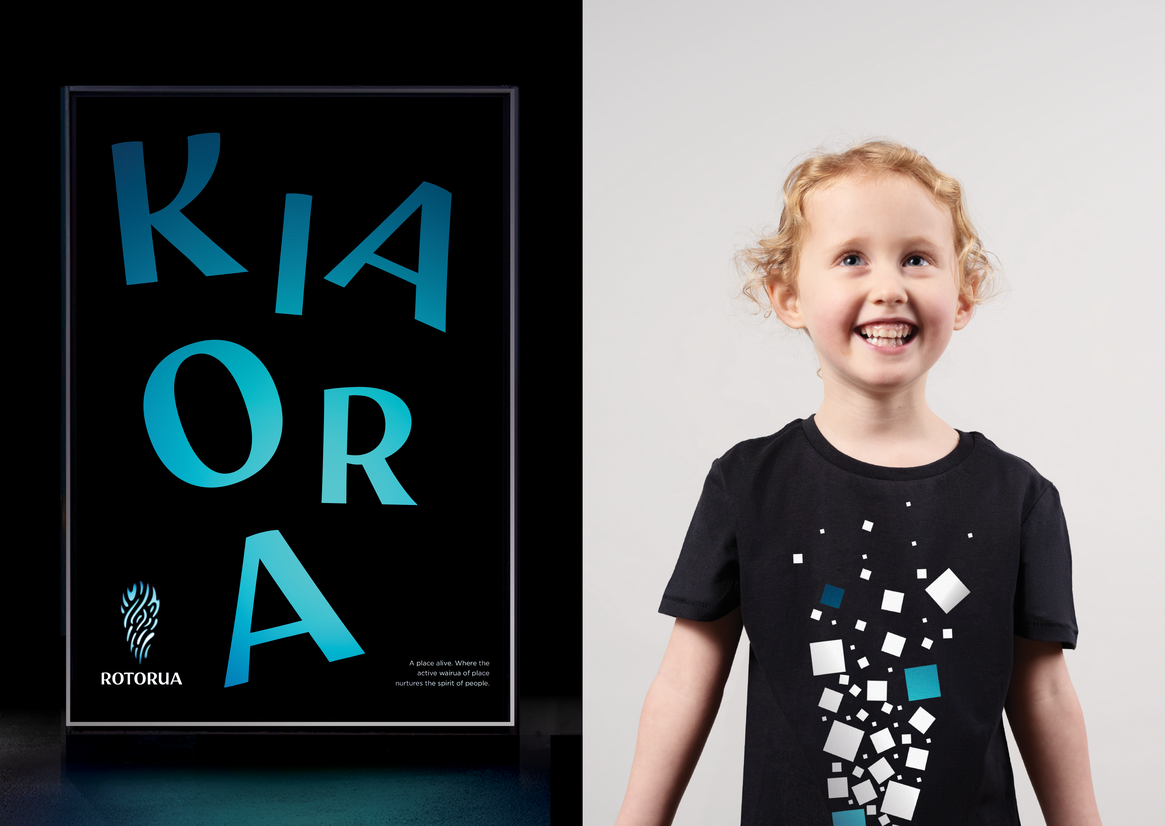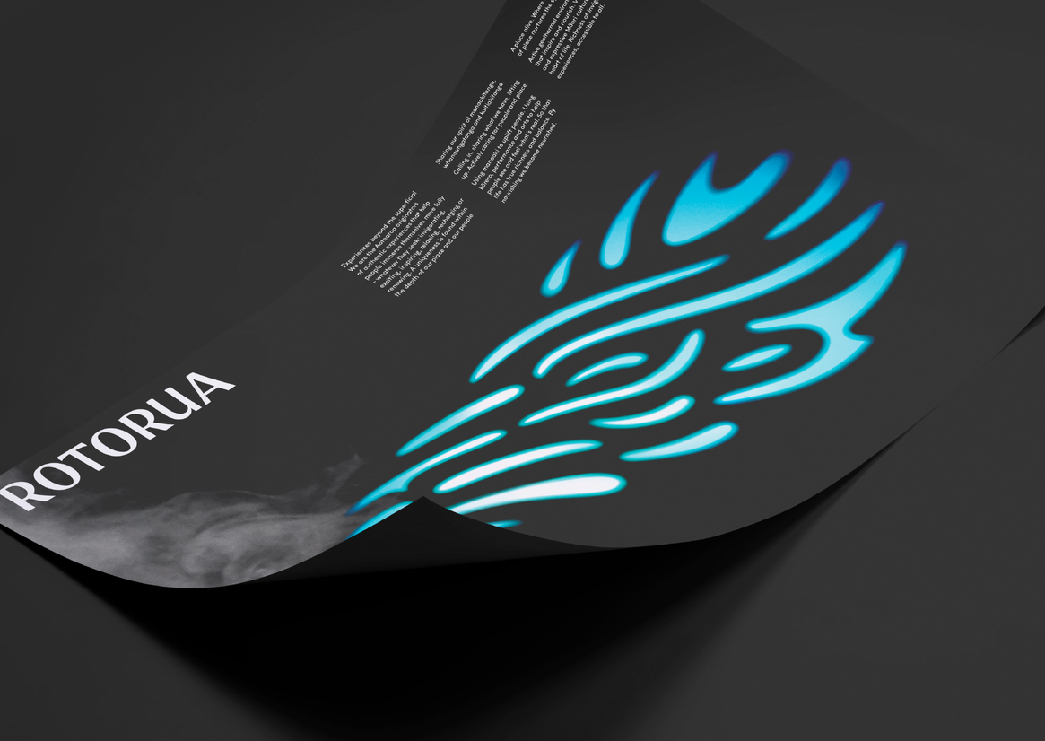 True uniqueness can only be found within. This tuakiri is crafted by an ancestral spirit, unique to Rotorua. It flows through its people, its whenua, its lakes, its whakapapa. Shaped by pūrakautanga, freezing to his death on the summit of Tongariro, the chant for warmth from Ngātoroirangi to his sisters Kuiwai and Haungaroa, ignited a trail of geothermal eruptions from Hawaiki. His chant courses through every detail of this tuakiri, wrapping its warmth around all who engage with it. It acts as a shimmering acknowledgment to the rich lineage of this place. Ko ngā pūmanawa e waru o Te Arawa – cloaked by the eight peaks, recognising the eight beating hearts of Te Arawa, those who keep the fires burning. Formed of 18 glowing droplets, reflecting the mauri ora of the 18 distinct lakes found within this place. Kauae ki runga, kauae ki raro, a frequency that coils upward, binding the earth to the sky, the physical to the spiritual. Embodied in a contemporary expression of its unique taonga, the famous luminous geysers. This place brand connects the rich past of Rotorua to its radiant future.
