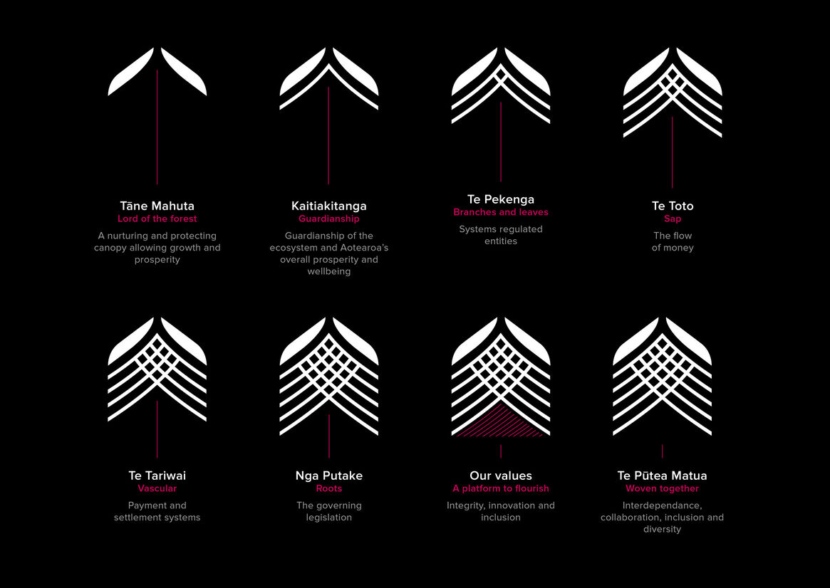 For the logo, the brief was to express the Reserve Bank’s core role. For some time, they’ve used Tāne Mahuta as a metaphor to explain their role as the kaitiaki (guardians) of New Zealand’s financial ecosystem, nurturing and protecting life under its canopy. With oversight and guidance from our cultural advisers, we developed a new logo that bought this metaphor alive.