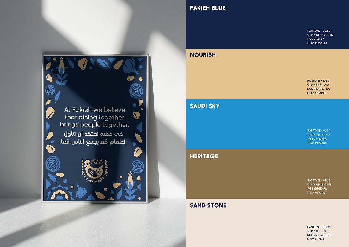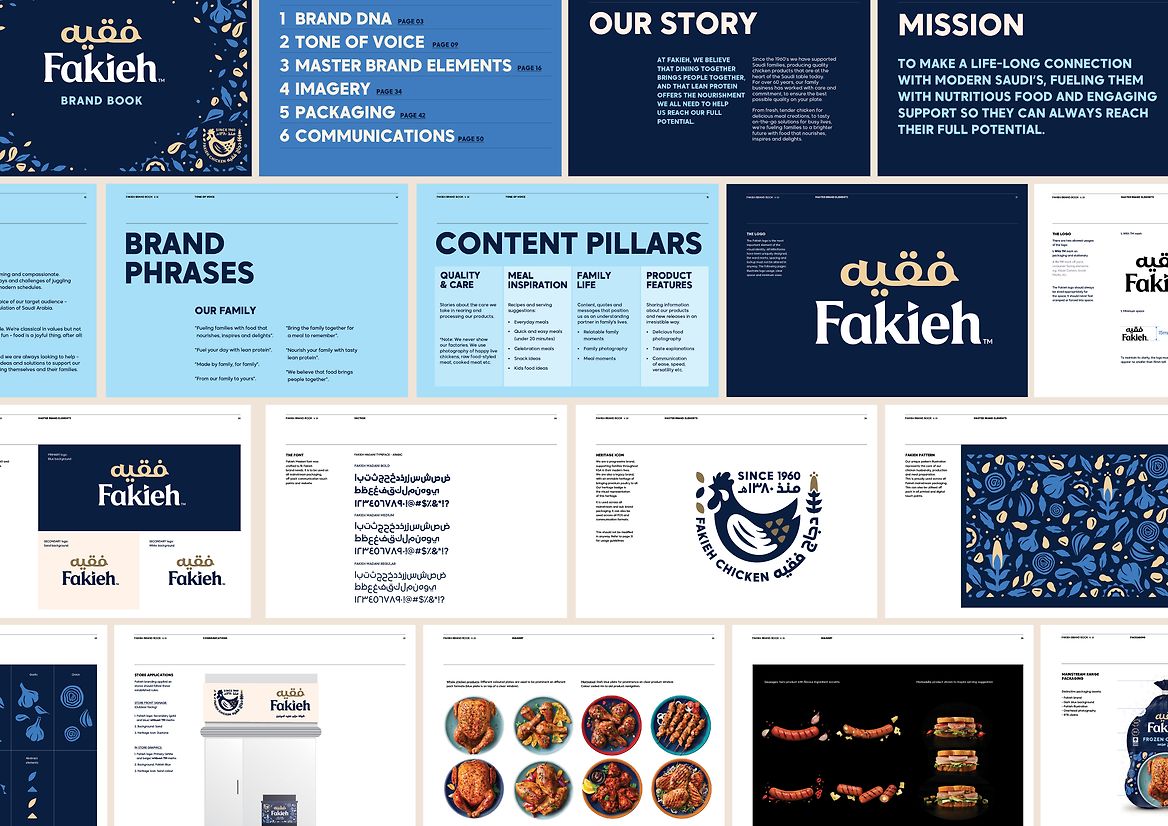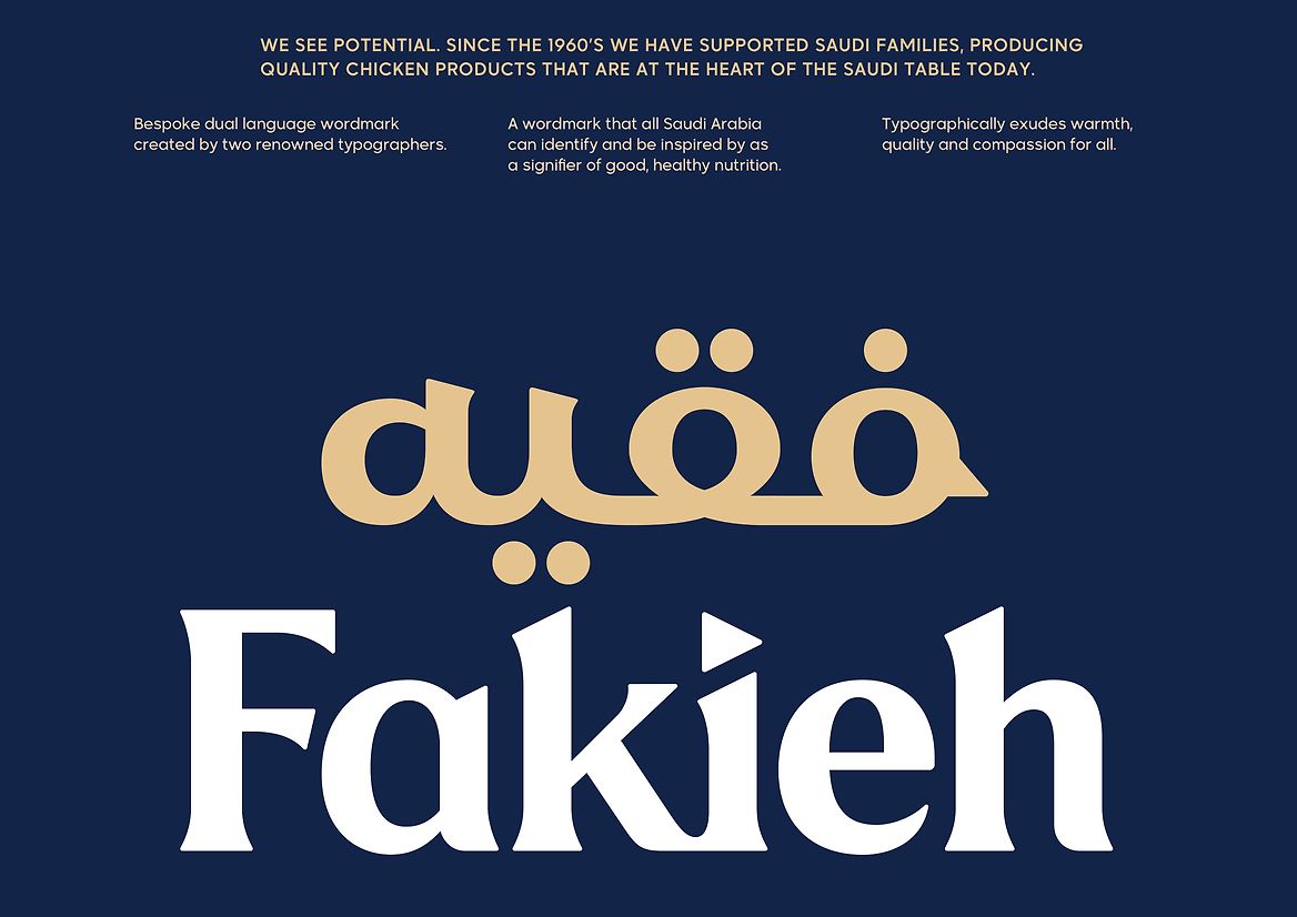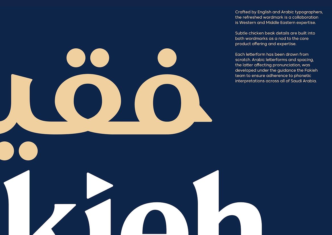 Working with the team at Fakieh, the new brand was treated as a revolution, with the previous brand incarnation devoid of relevant assets to build and evolve from. The new wordmark is a standard bearer; working with an English and Arabic typographer, we developed a dual language lockup that reflected its past while being the trustworthy, humble and compassionate brand to follow in the future. The traditional script was crafted to sit onto of Fakieh, mimicking a crown and the top ‘comb’ of a chicken. Subtle nods to chickens were built with beak-like shapes in both parts of the device.