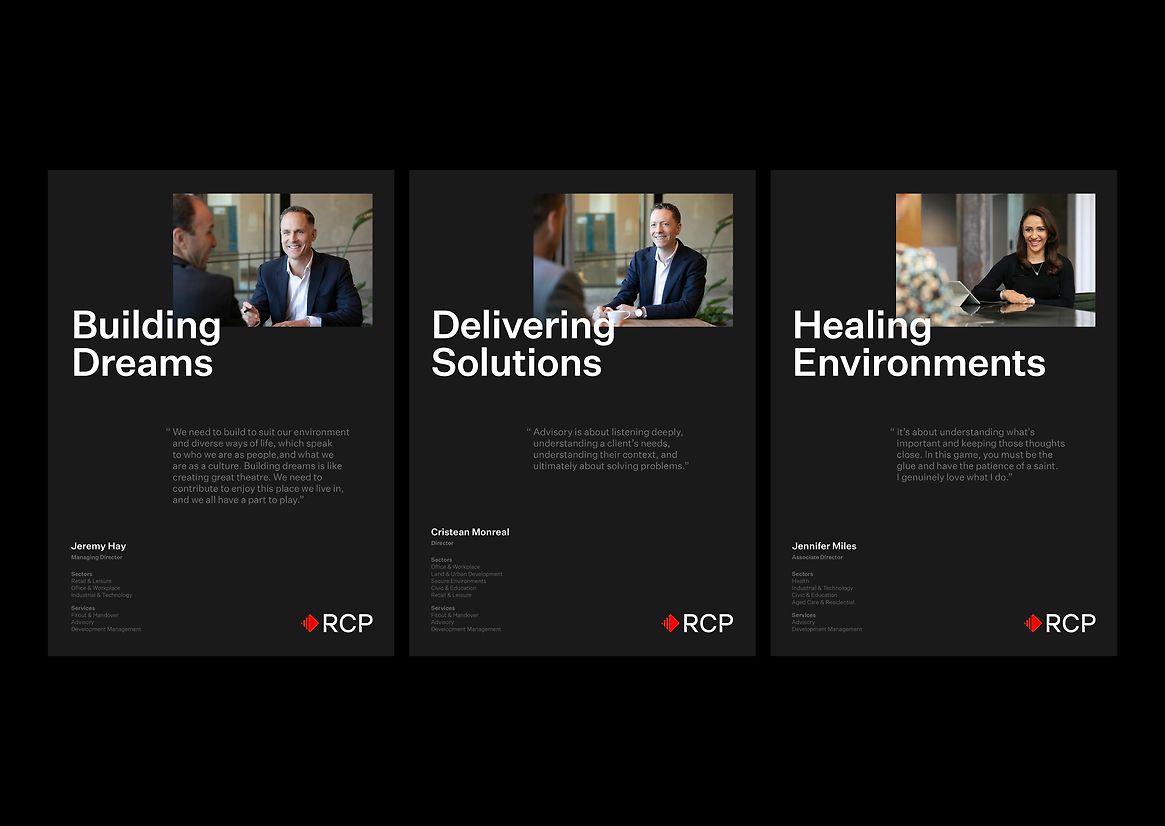 We began by affirming RCP's brand purpose—to "shape, organise, and deliver a better world." This became the basis for how they re-presented their services to the market, and the core of what their visual identity was built on.