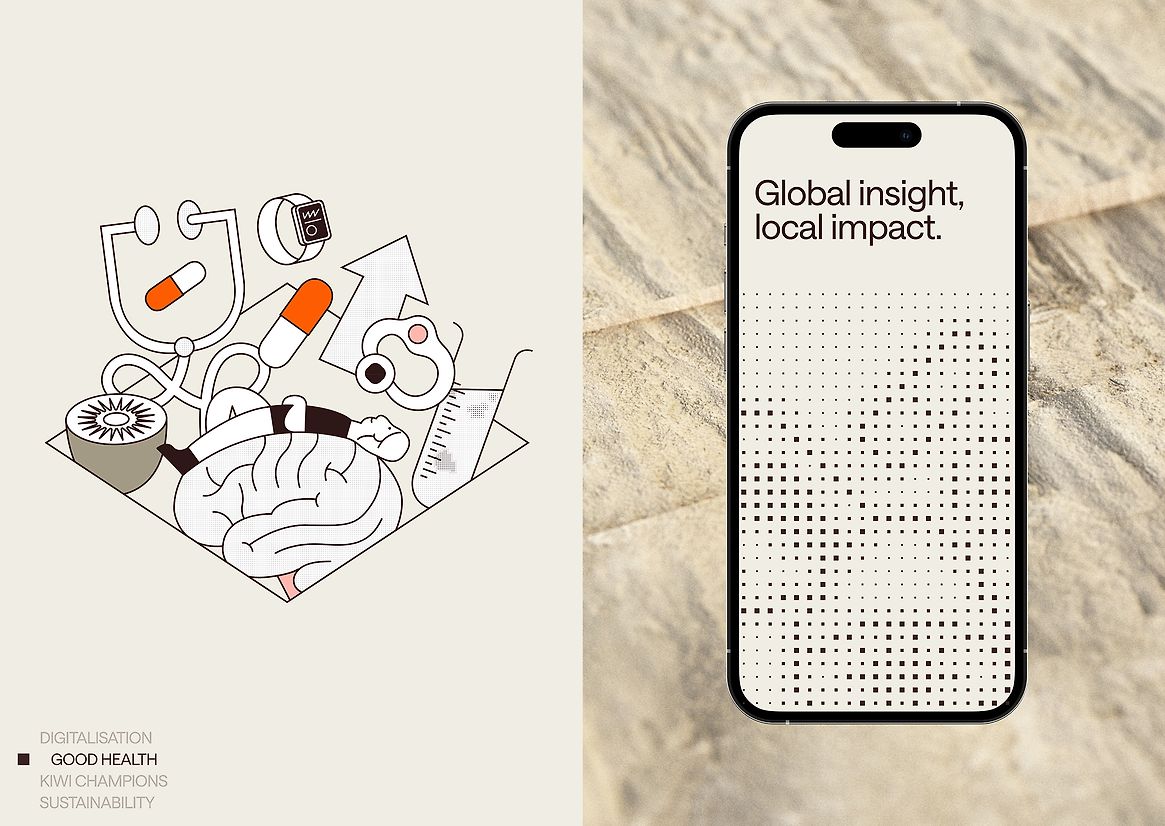 The entire graphic system is carefully considered, balancing the contrast between the global scale and the local heartbeat. This is reflected in the colour palette, which includes neutral tones inspired by Aotearoa’s natural landscape, and a pop of colour that signifies global innovation. The art direction emphasises GENEI’s vast impact on New Zealand, featuring striking landscape photography and evocative 3D textures.