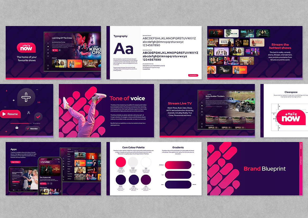 For the design, we embraced ThreeNow's existing watermelon colour and paired it with a deep purple to create a bold, contrasting palette. This combination can be intensified for marketing elements and subdued for product interfaces, allowing the content to take centre stage.
