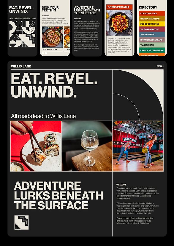 Willis Lane is much more than a branding project – it is a harbinger of urban revitalisation. The exhaustive brand system celebrates a series of transformative works at the heart of Wellington’s Golden Mile, bringing to life the vital intersection of Willis Street and Lambton Quay. What was once a tired, faceless food court is now a thriving destination for superior hospitality and entertainment – as Willis Lane has fast built a national profile and become a must-go destination when visiting the capital.