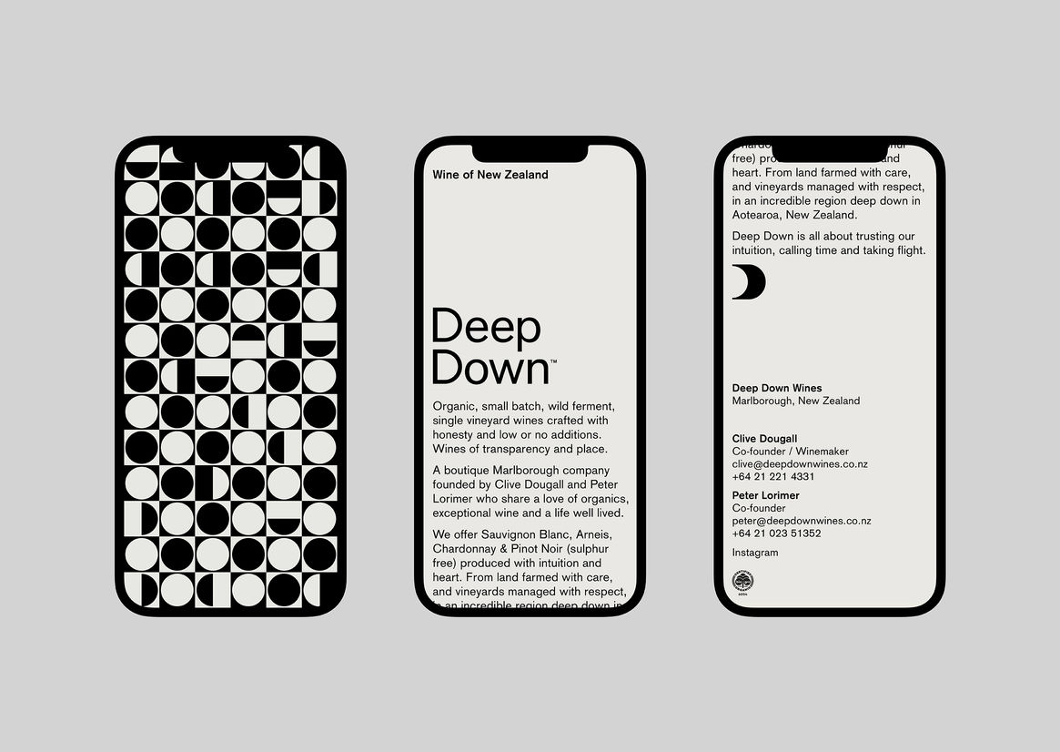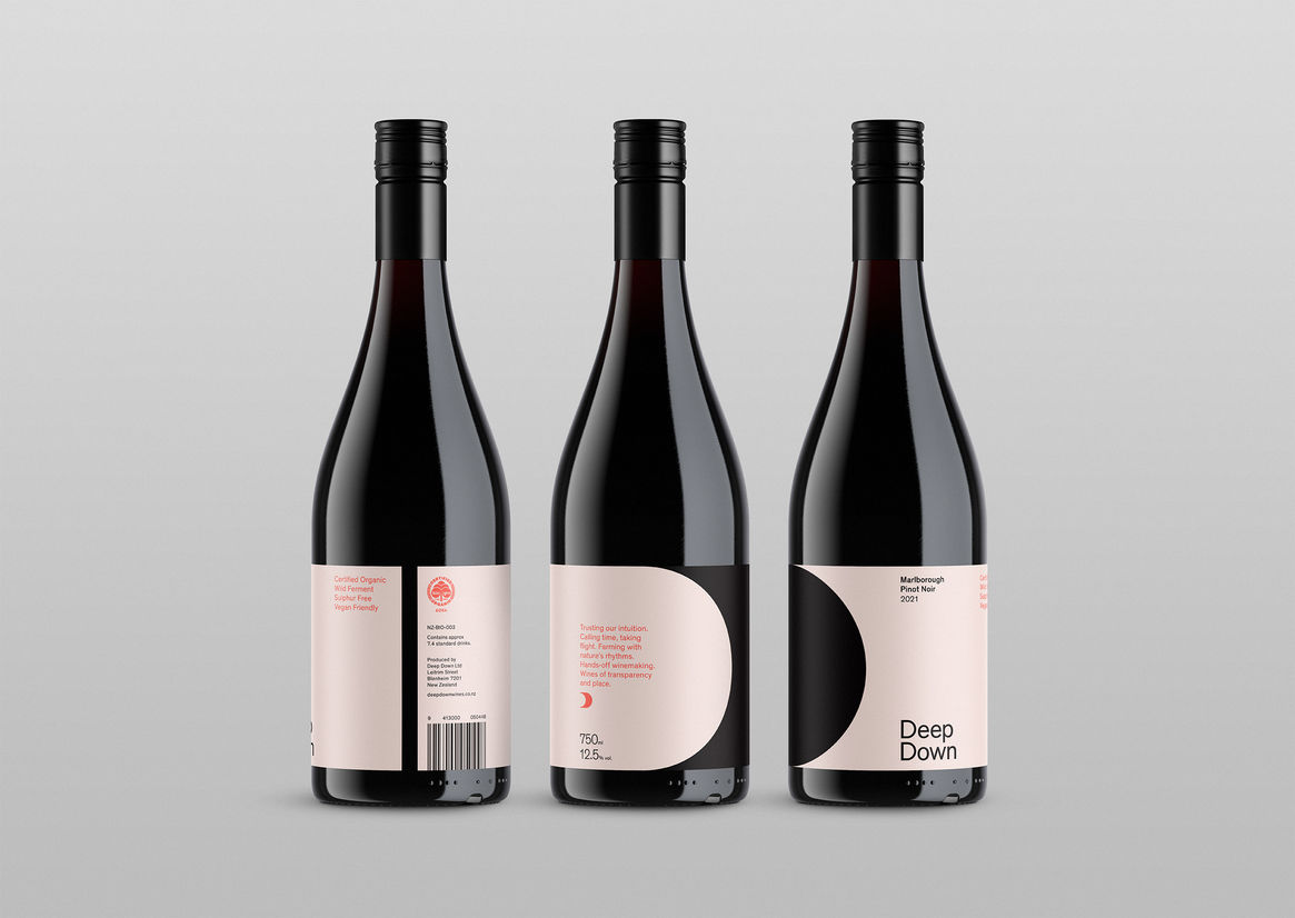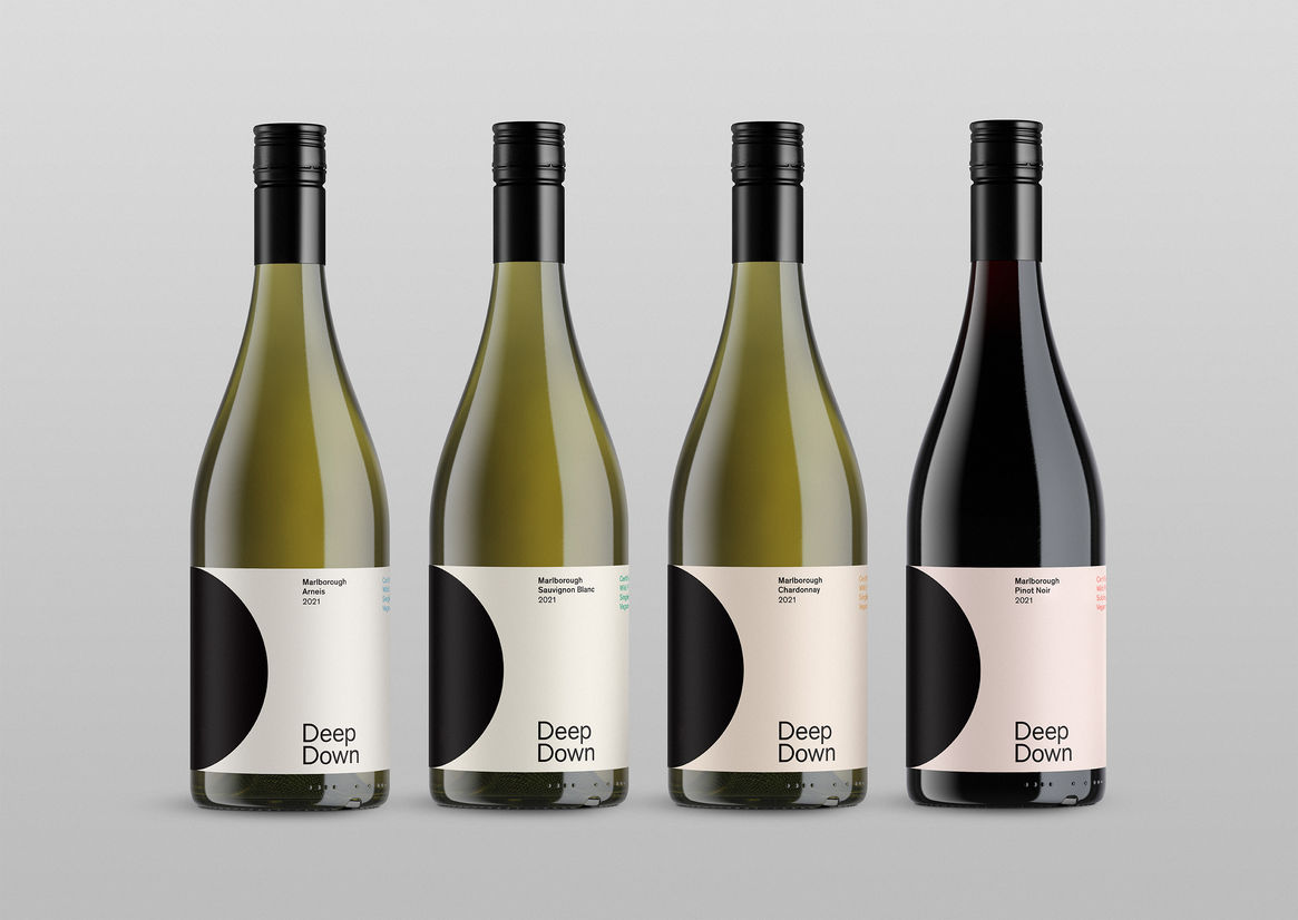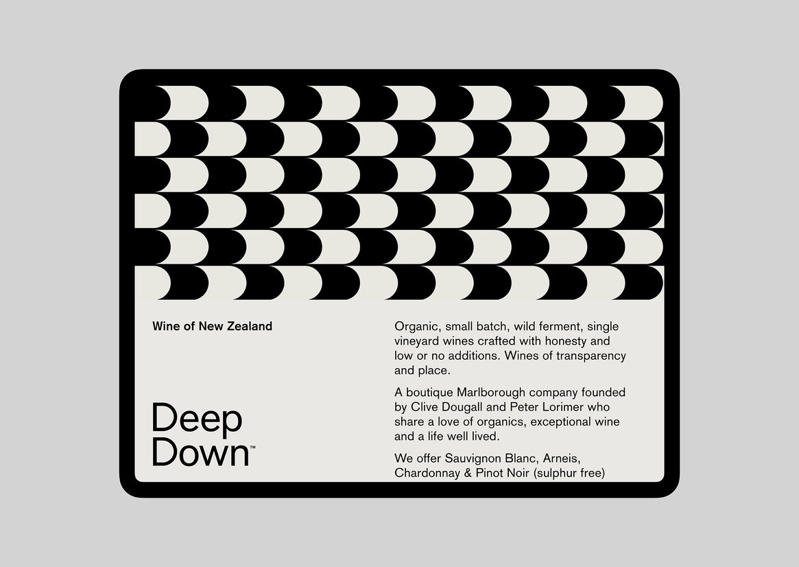 A recognisable geometric shape, an abstracted capital D occupies the entire height of the label and creates a memorable silhouette. When inverted on the back label, and aligned to the front, a distinctive longer shape, and double ‘D’ for Deep Down is created, which interacts with the curvature of the bottle itself.