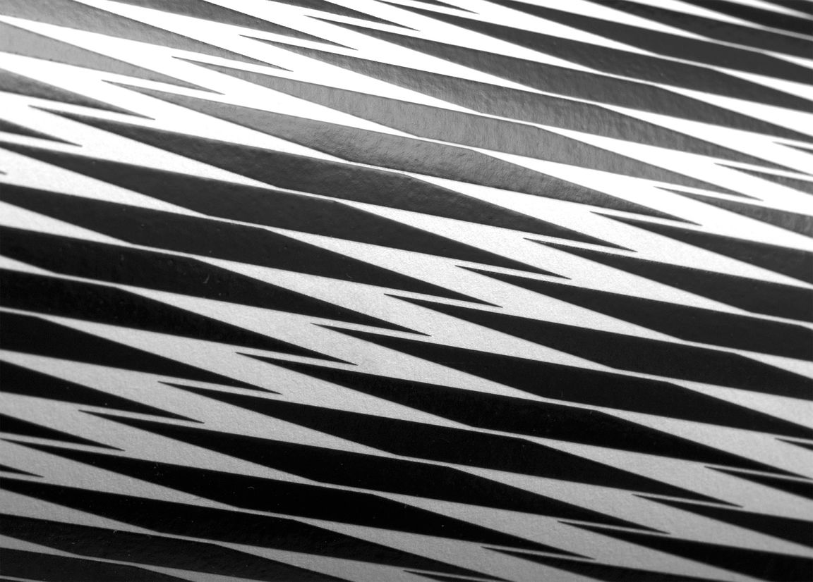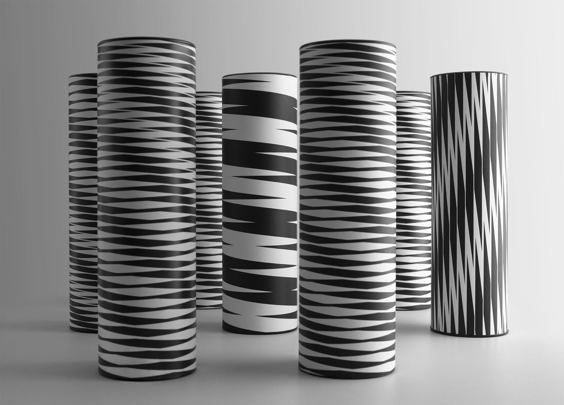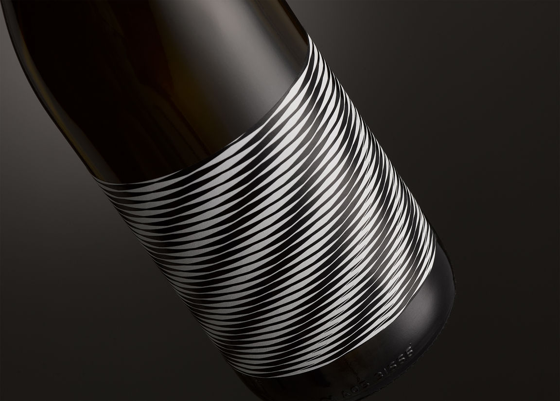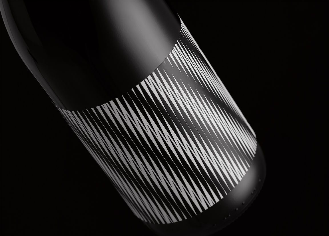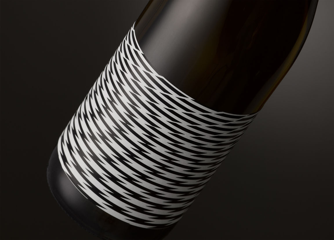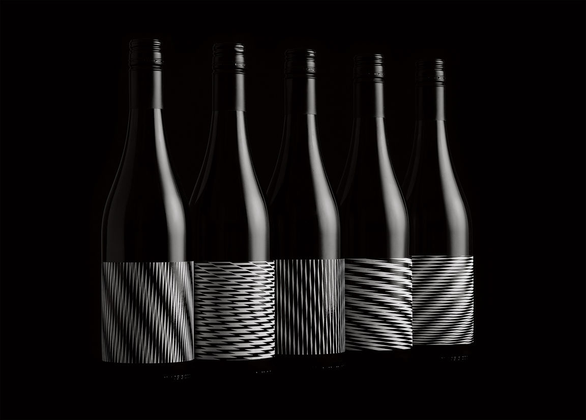 Each label features one of a series of optical illusions, created from repetitions of a parallelogram, that go slightly out of control. Some of the patterns have a cartoon tv static quality while others are like some sort of insane op art. The design effectively has no front label. Brand name, varietal, year, and region pushed to one end of the wrap label and mandatories occupying the other. Labels are economically printed one colour plus finishing. The result was a deliberately oblique and ambiguous wine brand that aims to defy category tropes.