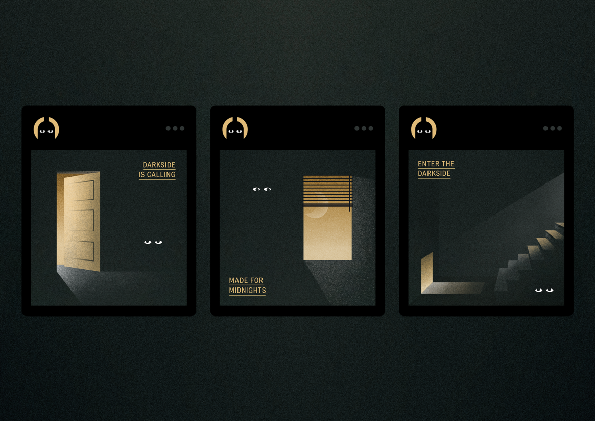 We embraced the idea of channelling the essence of the night, inspired by the dark and smooth product with notes of mischief and mystery. Imagining Darkside as an invitation to take a walk on the dark side, to try something deep and stimulating, to chase the night instead of turning in early.