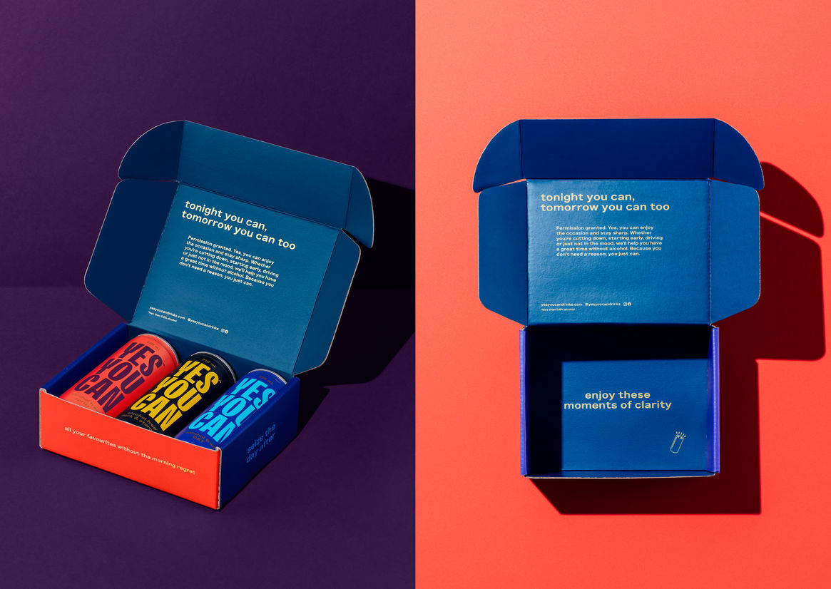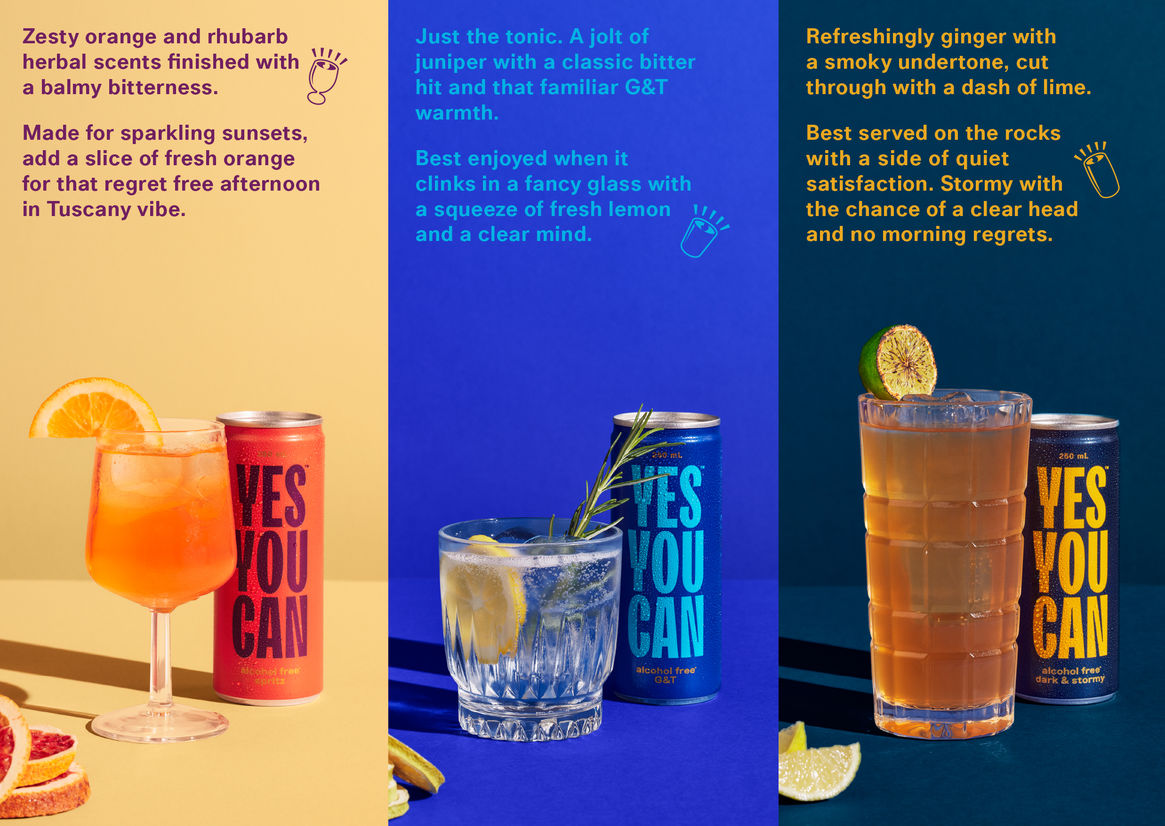 Given the challenge above, and the audience we’re talking to, we established early that Yes You Can was going to be a refreshingly positive, inclusive, and non-judgmental brand. The brand name is a statement of intent, referencing the willpower required to cut down, giving you permission to do your own thing, or if you just want to pace yourself by mixing your drinking with a non-alc breather, now you can.