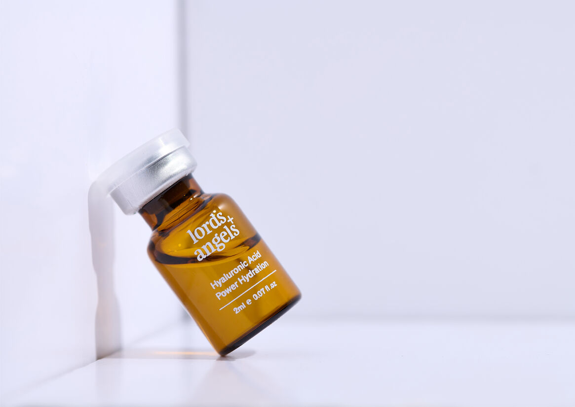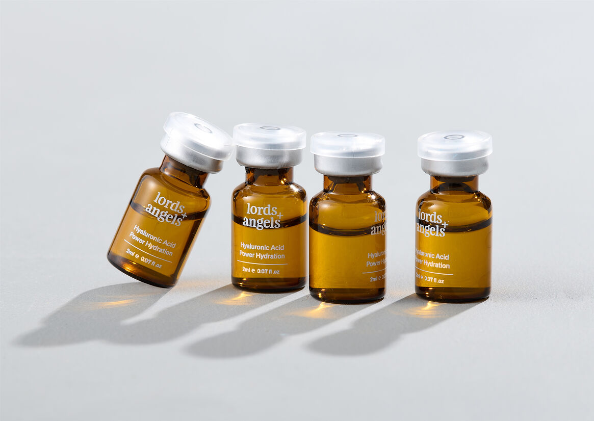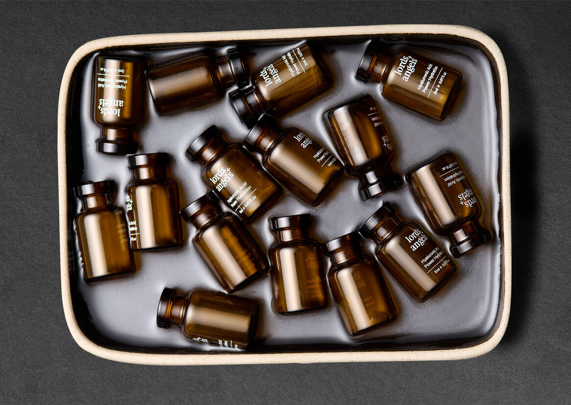 The amber glass ampoules are designed to look medicinal yet serve a functional purpose to protect the hyaluronic acid from light.