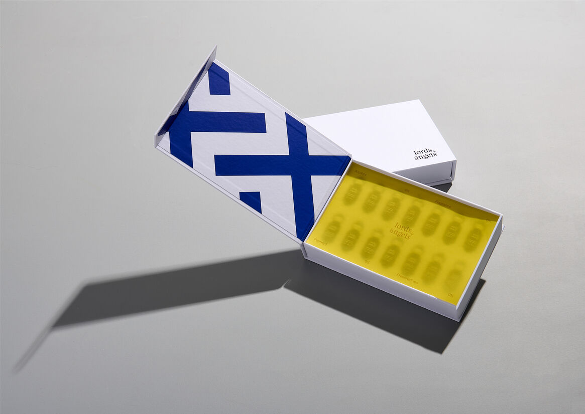 True to an Alchemist archetype, The Lords + Angels brand identity blends old-style Feijoa typography, with sans-serif Söhne ( by Klim Type Foundry) representing science. The crosshatch pattern derived from the + in the identity and bold colour system inspired by stained glass windows is used across all brand touchpoints.