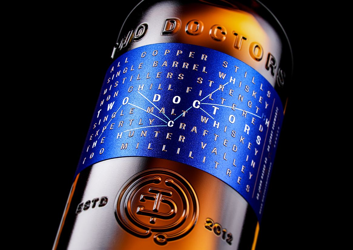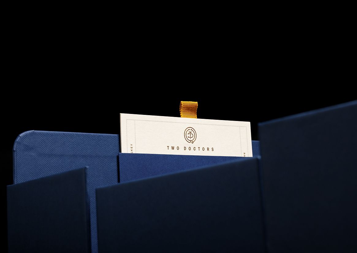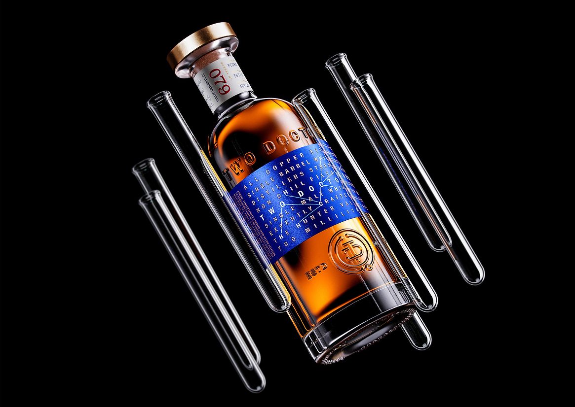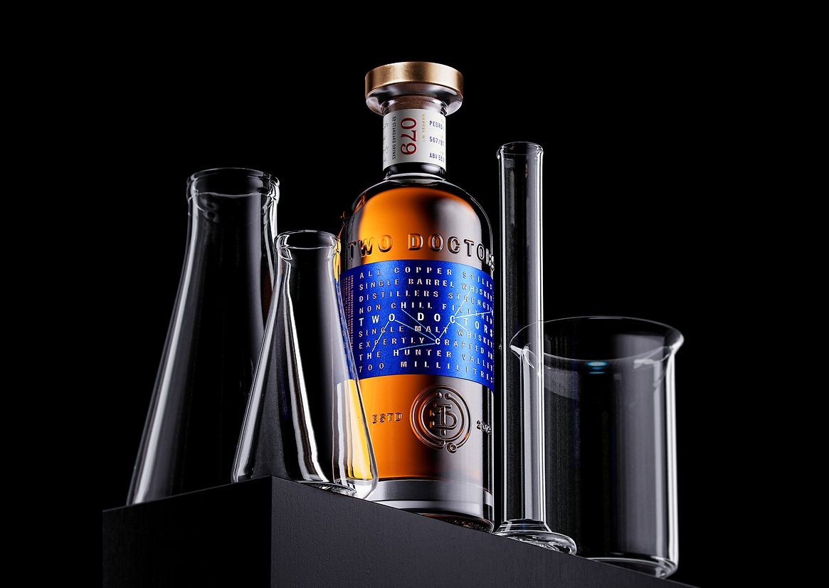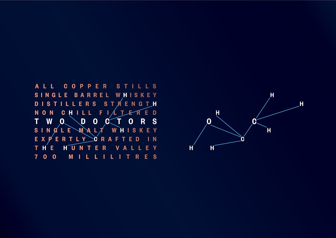 The precision science of whiskey-making guided our design thinking, underpinned by themes of patience and heritage. The brand icon is formed by a T&D locked up within a stethoscope, a nod to the medical background of the two founders. This creates a bold brand stamp, which like the product, brings a touch of playful eccentricity to a traditionally serious and refined category. A closer look at the label links up key letters to reveal the precise ethanol formula used, subtly connecting the Two Doctors typography and the meticulous science involved.
