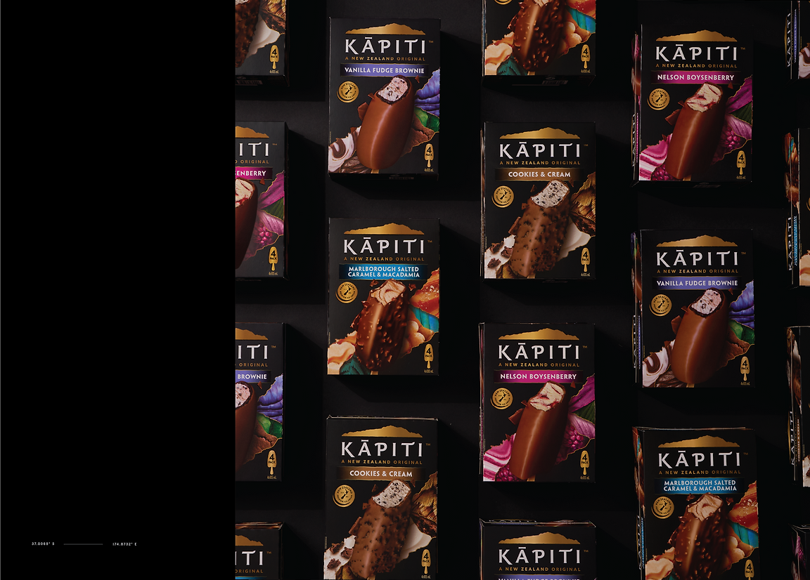 The packaging design visually represents where nature meets indulgence, featuring the crafted Kāpiti island map, native flora and fauna, and indulgent ingredient photography. Increasing the prominence of the brand mark reflects pride and reinforces the provenance story. Premium finishes like spot gloss and metallic accents create a harmonious and vibrant range that integrates seamlessly with campaign touchpoints.