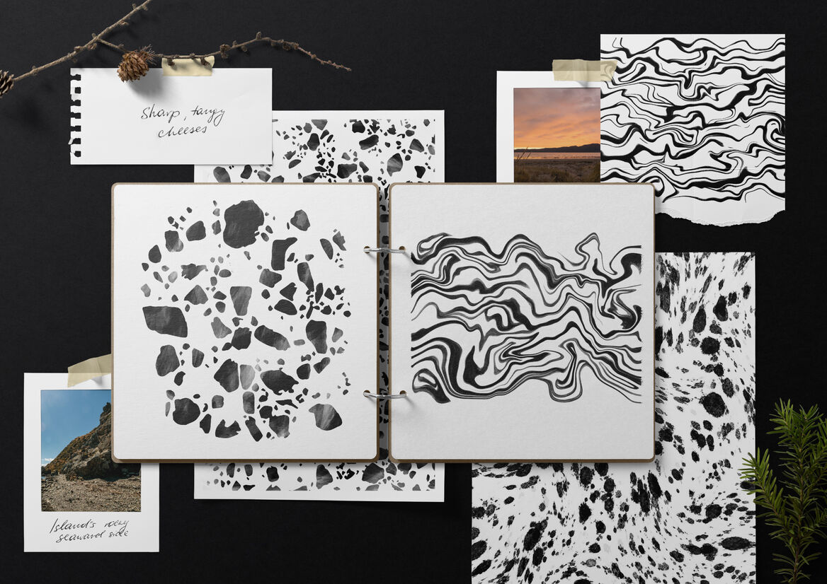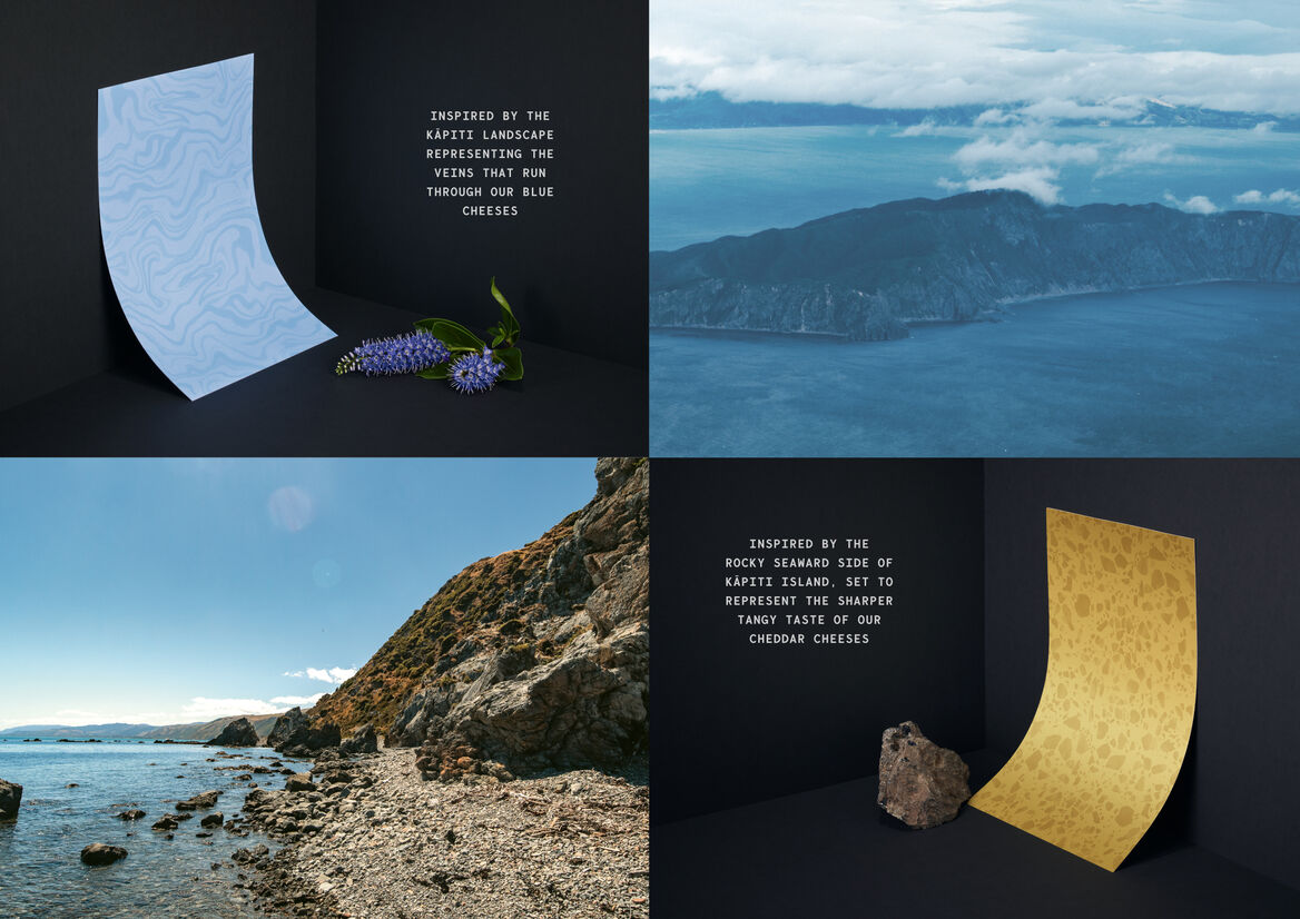 Naturally, we drew inspiration from Kāpiti Island. With its rugged landscape and wilderness, the island became our dramatic muse. Hand illustrated patterns tell the story of the coast and terrain, symbolising the rich taste profiles of each of the cheeses, and a bold crop of the island’s silhouette creates a distinctly ownable shape running across each of the cheeses.