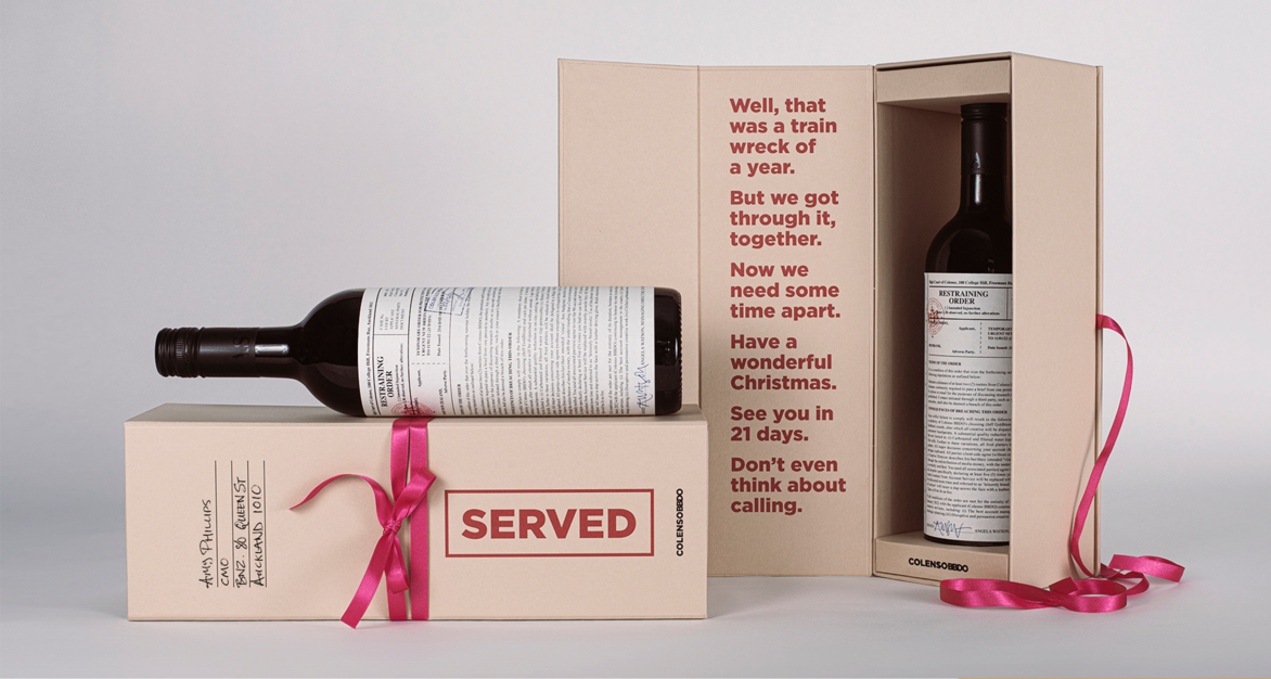 So this Christmas we sent our clients a restraining order, prohibiting any contact for 21 days over the Christmas break. The order was beautifully designed into the label of a bottle of wine, each packaged in a manila box and ‘served’ to our clients in person.