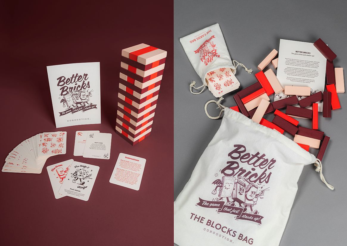 The strategy and concept behind the project were meticulously crafted to ensure depth of thinking and alignment with our core purpose. In addition to the donations, we wanted to offer clients something fun and educational to use over the summer holidays. We developed an educational card game inspired by the popular game Jenga, which tied into themes related to the charity's work involving bricks and buildings. This game was designed not only to entertain but also to educate players about the significance of the charity’s efforts in providing shelter and building communities.
