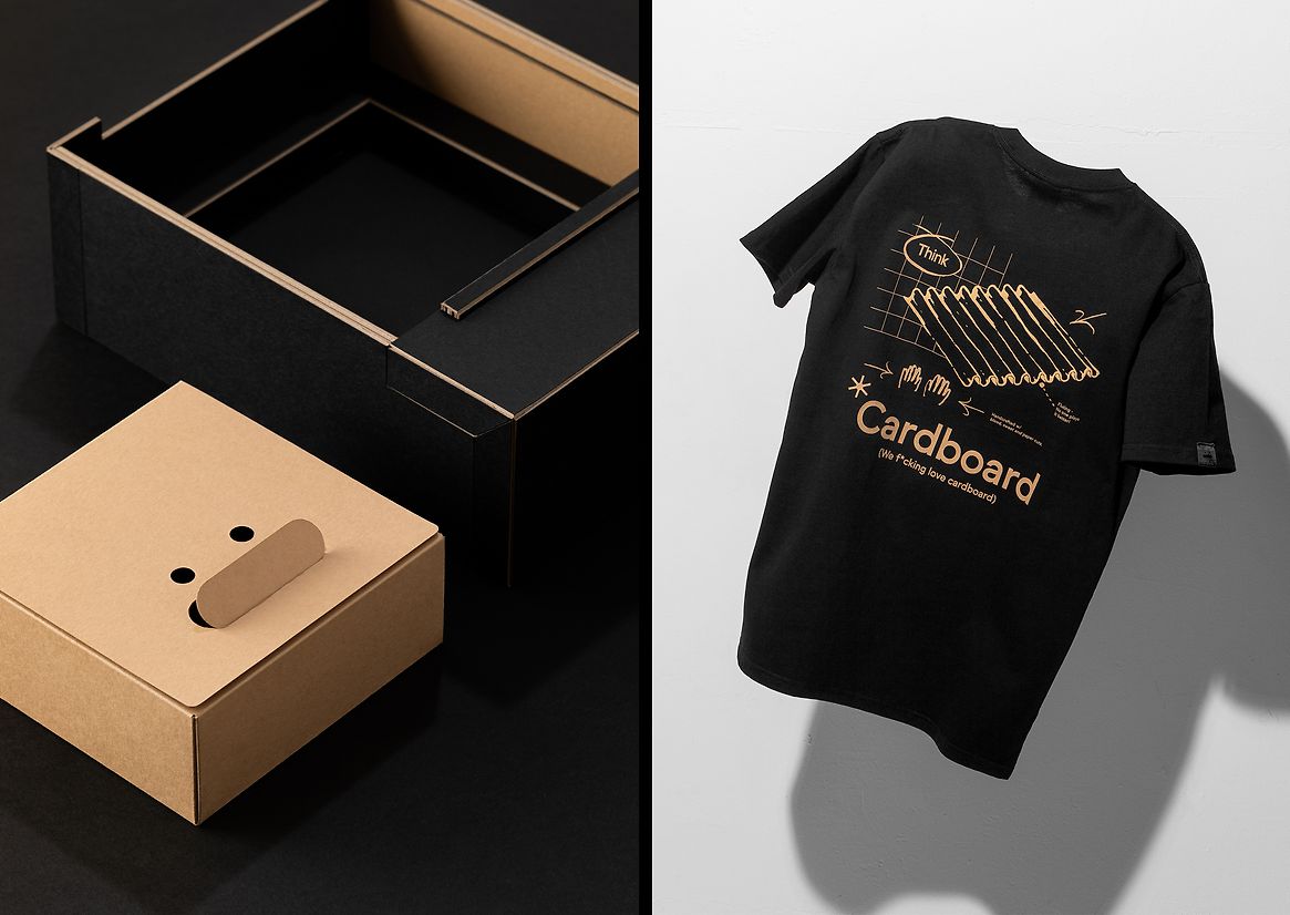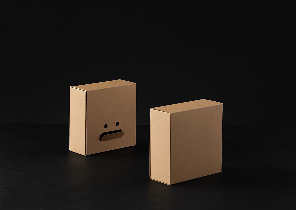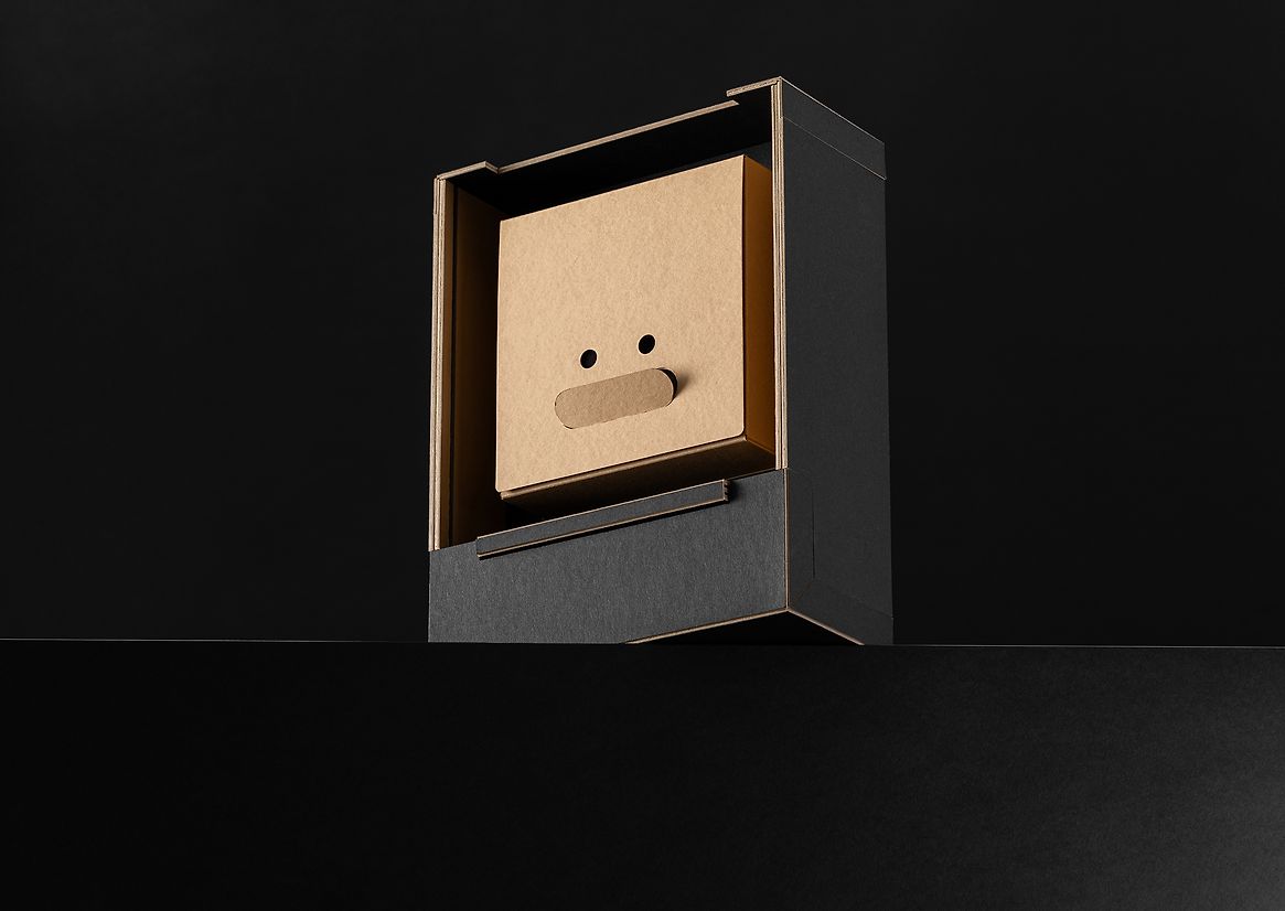 The idea was to package these in a bespoke box, showcasing our talents in structural packaging, and send these out to each other's clients as a limited edition, self-promotional gift. The challenge was to create a memorable unboxing experience. Rather than just receiving a T-Shirt in a courier bag, ripping it open and chucking it on, we wanted the recipient to take and savour the moment to get to the goods. The box is designed to show the cardboard's effortless natural beauty. There's purposely no print or branding on this box, just lovely raw, sharp edges, perfectly crafted and scored so the front panel glides open, mimicking the motion of screen printing. We incorporated a mischievous face into the box design to add a personal touch and reveal the sender's identity. The box could be sealed and interacted with by utilising a design feature in the mouth, popping open to reveal the tee inside.