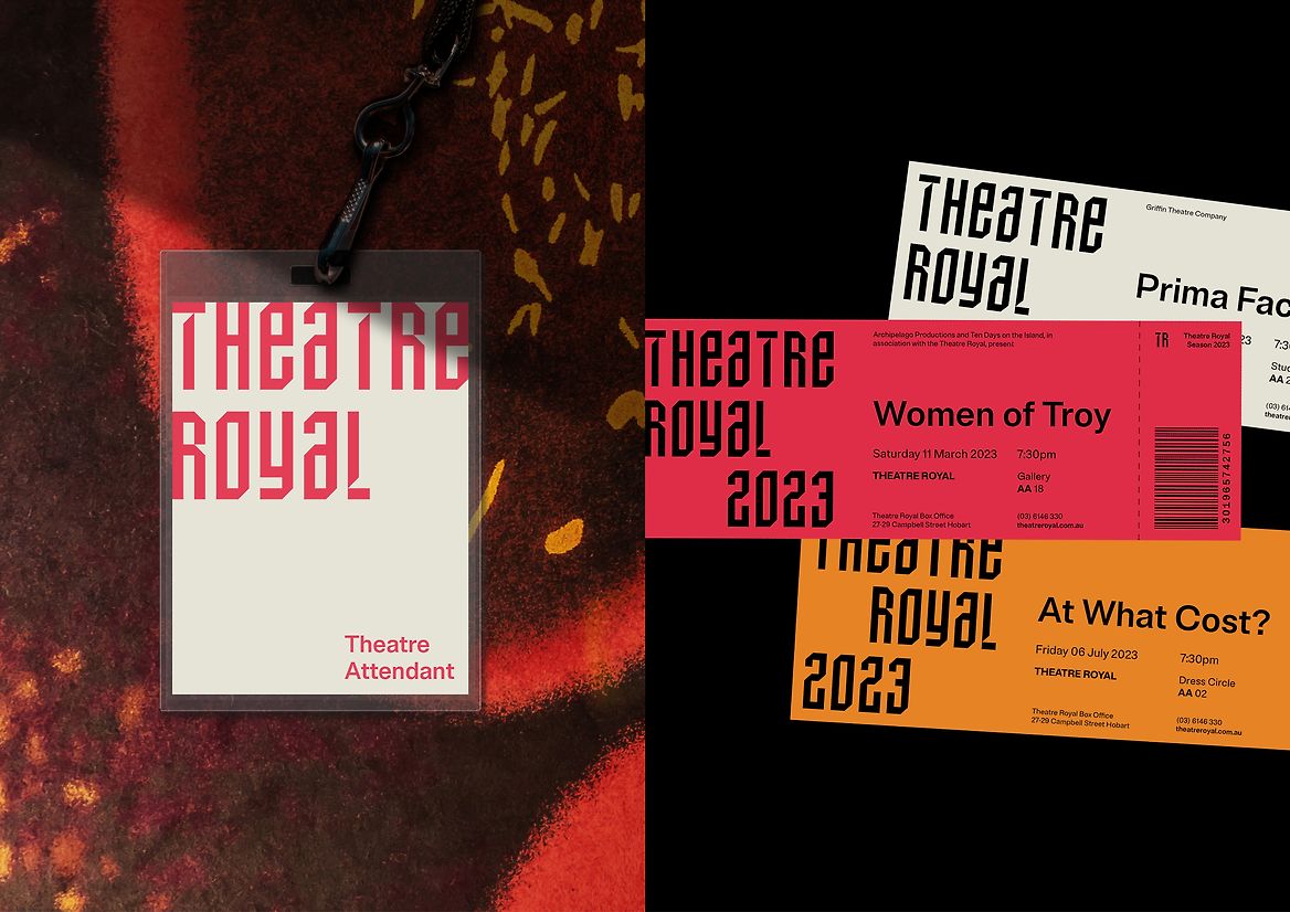 ‘TR Facade’ is a custom, mixed-case, modular display typeface, inspired by the panelled, opalescent facade and interlocking forms of ‘The Hedberg.’ It’s intentionally untraditional in appearance, establishing a strong, contemporary graphic language for the theatre. The mixed-case usage was chosen as it allows Theatre Royal to communicate in the lowercase conventions used within palawa kani (the Indigenous language of luriwata’s palawa people) — establishing Theatre Royal as a contemporary and welcoming theatre for all Tasmanians.