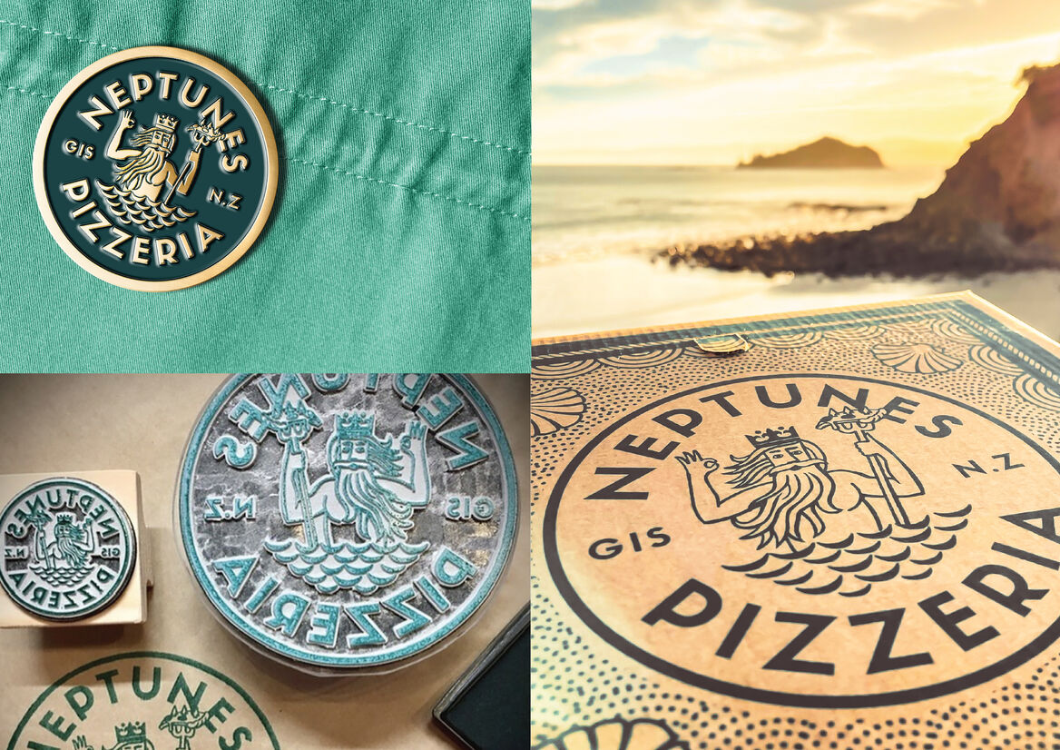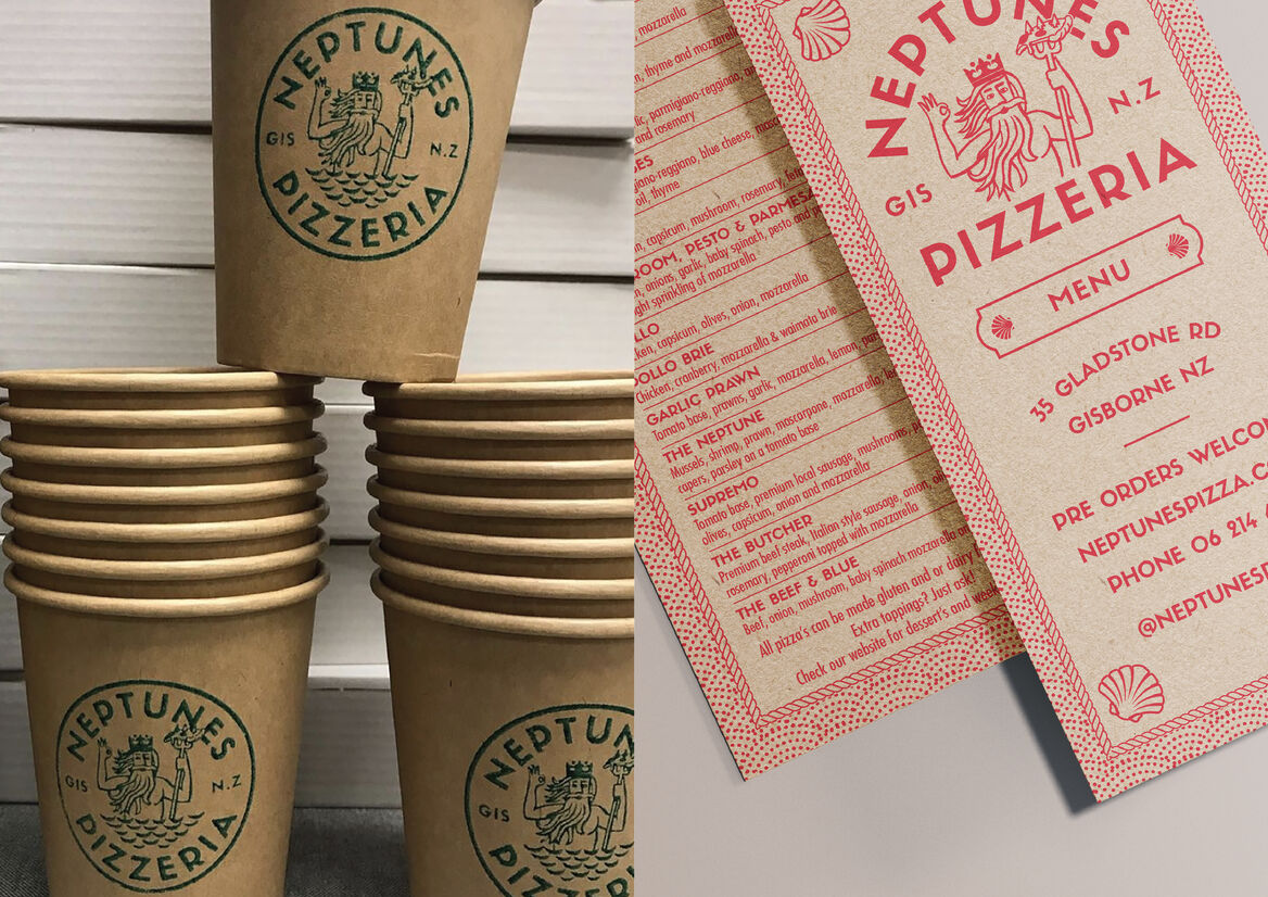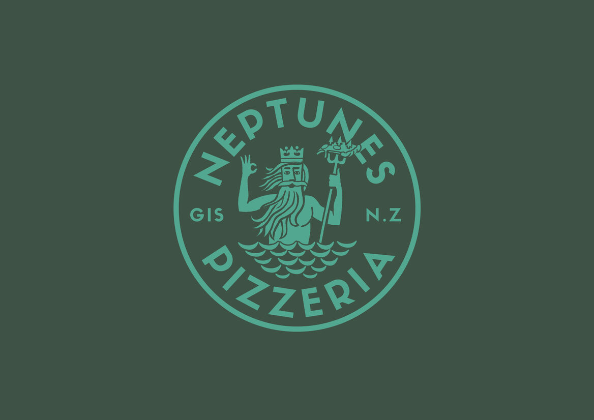 Founded in 2020 Neptunes Pizzeria is a family run business based in Gisborne, New Zealand. Leah and her team source the best local produce and hand make everything from scratch - this provided a great opportunity to create a bold, crafted and memorable icon, which stands out from the fast food franchises further up the street. Positioned within casting distance from the Fishing Port, the brand takes on a nautical theme with a colour palette inspired by the East Coast. The identity centres around a hand drawn Neptune icon rising from the waters of the East Coast with a slice of pizza speared onto his trident. By going against the current, Neptunes Pizzeria has developed a cult following of their legendary pizza!