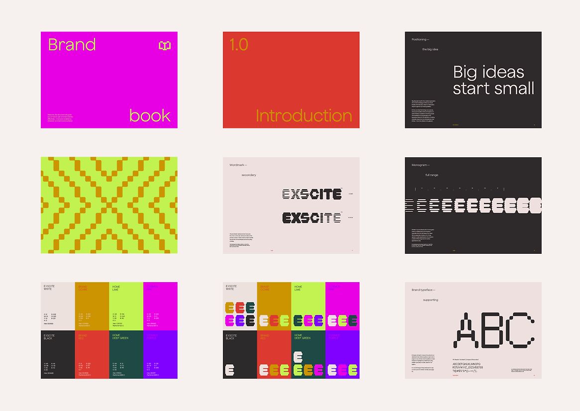 The colour palette is varied and bright to tick the playful box and excite Exscite’s main audience: kids. The swatches are typically paired together with two warm colours for the brand itself, two greens for ‘backyard’ and vivid pink and purple for ‘cosmos’.