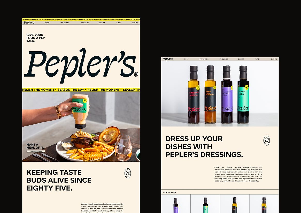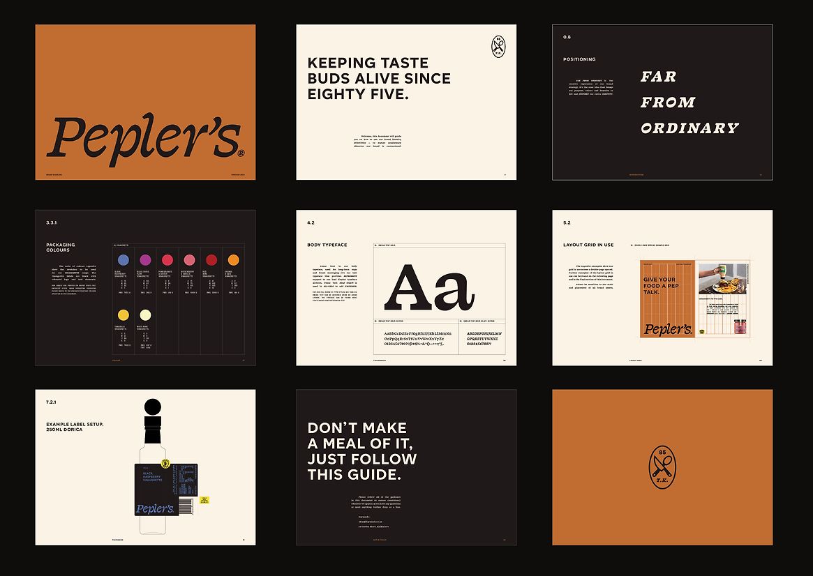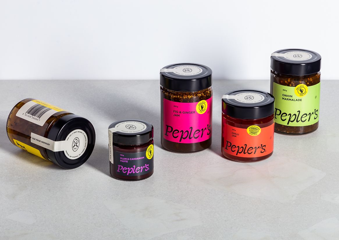 Our design blended historical elements with modern touches. The "Far from Ordinary" concept differentiated Pepler's from mainstream competitors through a unique wordmark and typography that conveyed an unexpected yet premium feel. We drew inspiration from their cookbook origins in the 1980s and the regional influence of Te Kauwhata, a location not traditionally associated with gourmet products, to emphasise their innovative offerings like pear and mustard—a truly unique flavour combination.