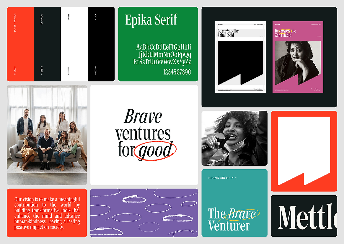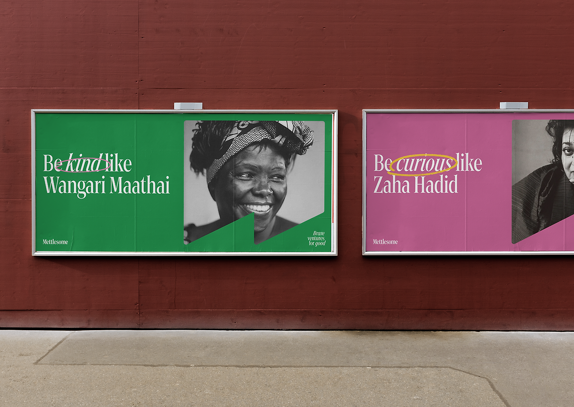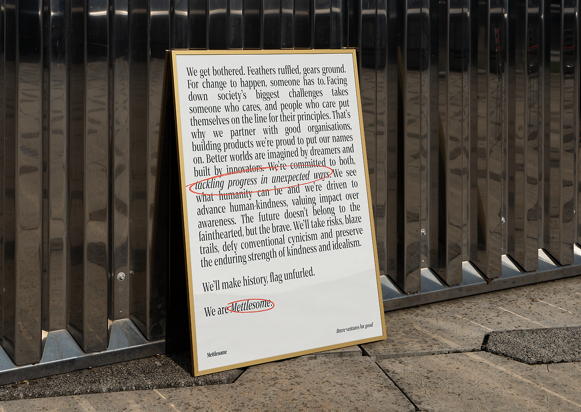 The big idea was developing their new name, "Mettlesome," meaning full of spirit and courage, to embody their values of bravery, curiosity, and kindness. The tagline "Brave ventures for good" educates their audience about their mission, solving a key challenge prior to their rebrand. Now recognized as a ventures studio with non-profit roots, partnering with organisations to address complex social challenges, the name Mettlesome conveys a bold, innovative spirit, allowing the brand to build a unique and meaningful identity in the social impact space.