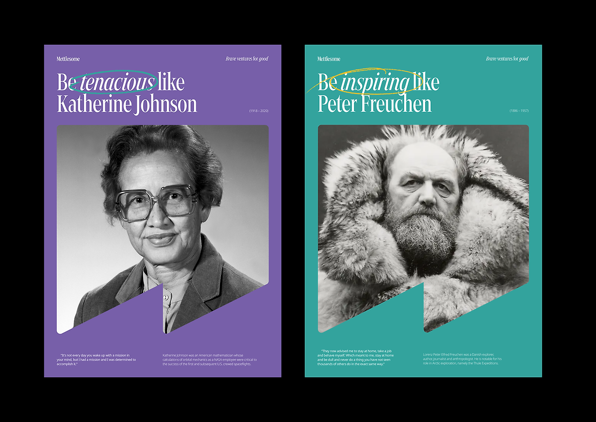 Collaborating with the Mettlesome team and involving them in creating the new brand fostered stronger engagement. We ran brand values workshops where they selected notable historical figures like Boudica, Katherine Johnson, and Zaha Hadid, who embodied traits they admire. We also captured the team's hand-drawn annotations for use in the rollout, giving them a sense of co-creation.