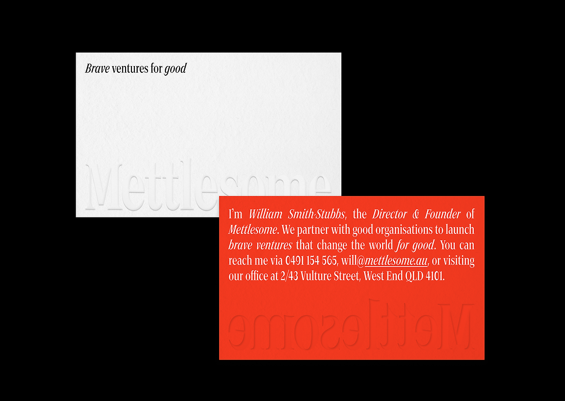The design of Mettlesome reflects courage and action with vibrant vermillion orange and a flag icon symbolising change. The striking wordmark, featuring sharp serifs, signifies a call to action and the organisation's readiness to engage. This visually compelling identity aligns with their mission to tackle social issues head-on. By creating a modern, dynamic look, we ensured the design communicates Mettlesome’s innovative approach and dedication to making a significant impact in the social sector.