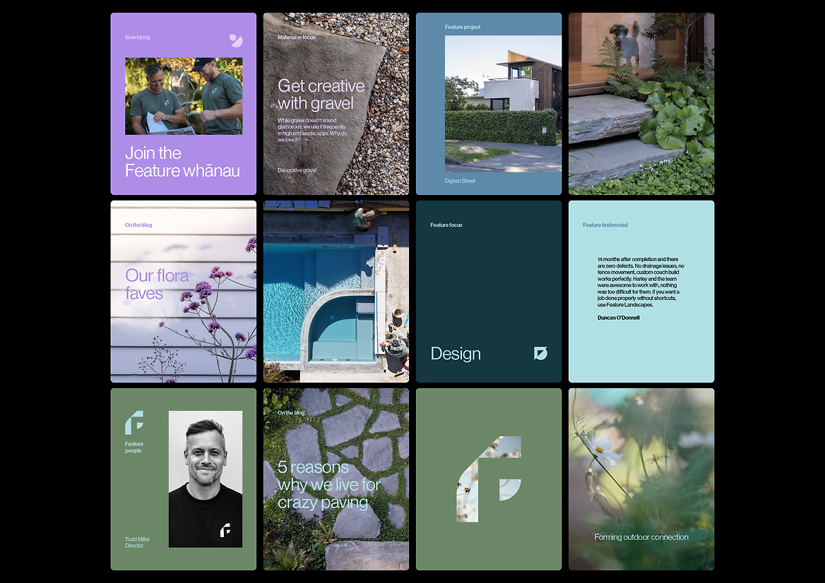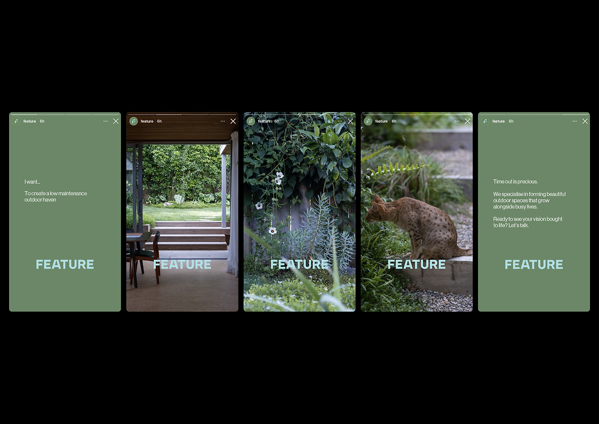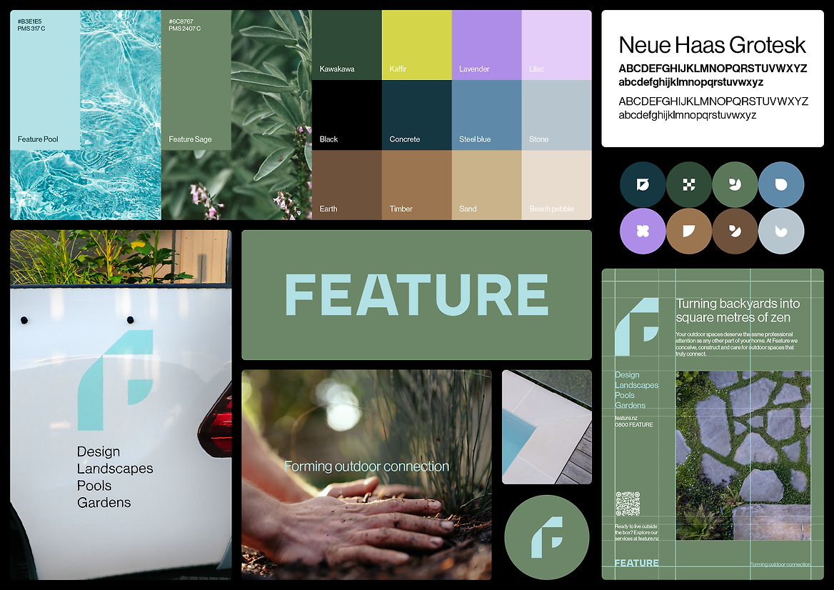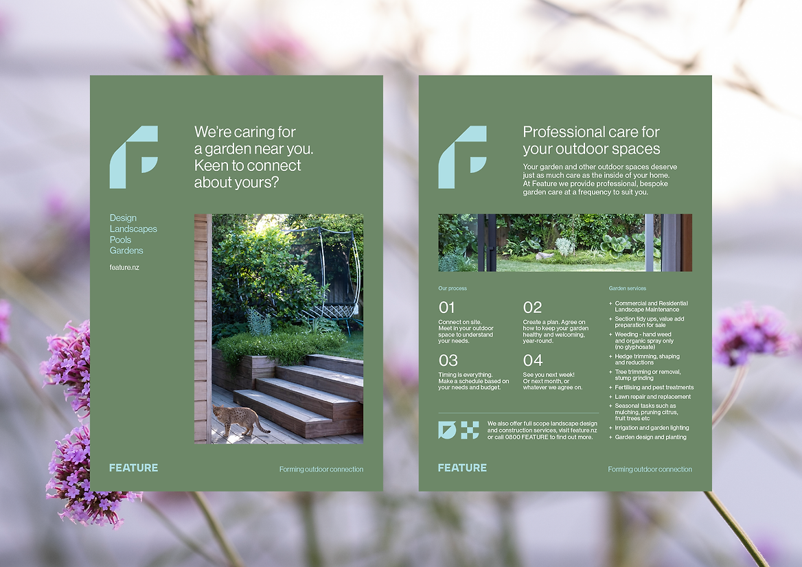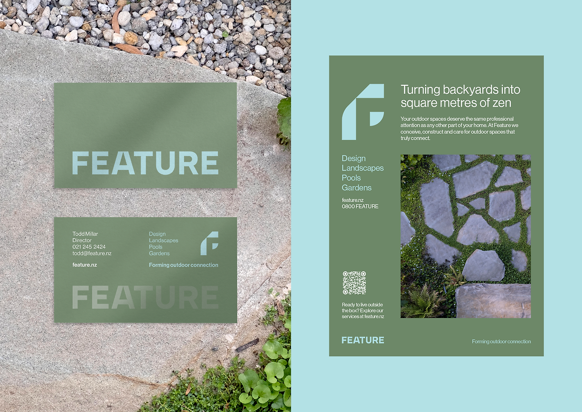 Presenting the service offering (design, landscapes, pools, gardens) as a key brand element was essential to support Feature’s name change and position Feature as full-service outdoor specialists.