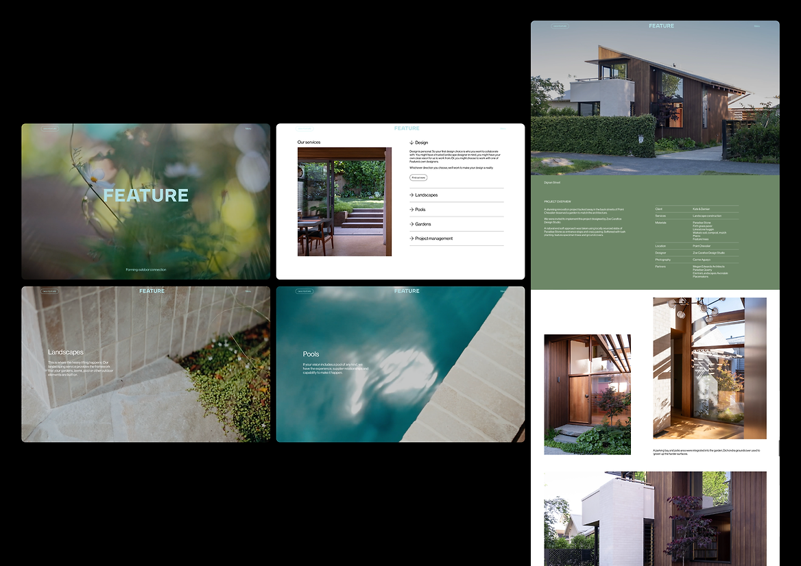 A calming colour palette, inspired by the natural world and industry materials provides a serene backdrop for Feature’s case study photography. A minimal approach to typography and grid-based layouts were employed to further cement Feature’s position as design leaders.