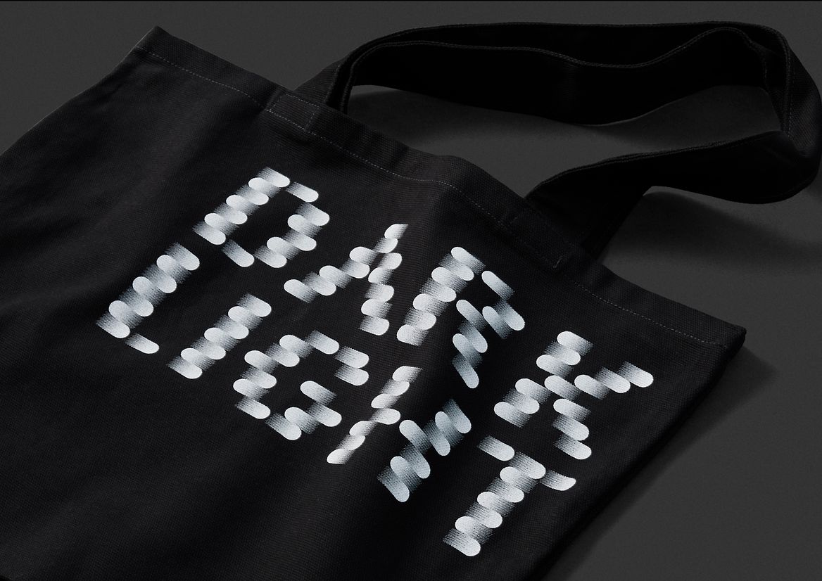 Posters and brochures bounce between black and the colourful hero image. The website and brochures transition between light and dark, and exhibition lightbox signage scatters the wordmark into a dispersement of textural fragments. These comms elements were backed up with a range of screen printed merch items.